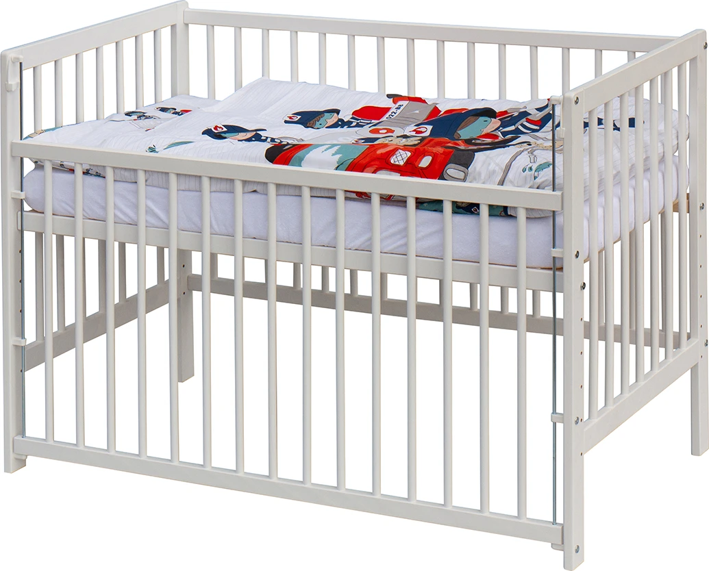 1. Detská drevená postieľka 120 x 60 cm - biela, masív borovice, sťahovací bok, 6 polôh roštu