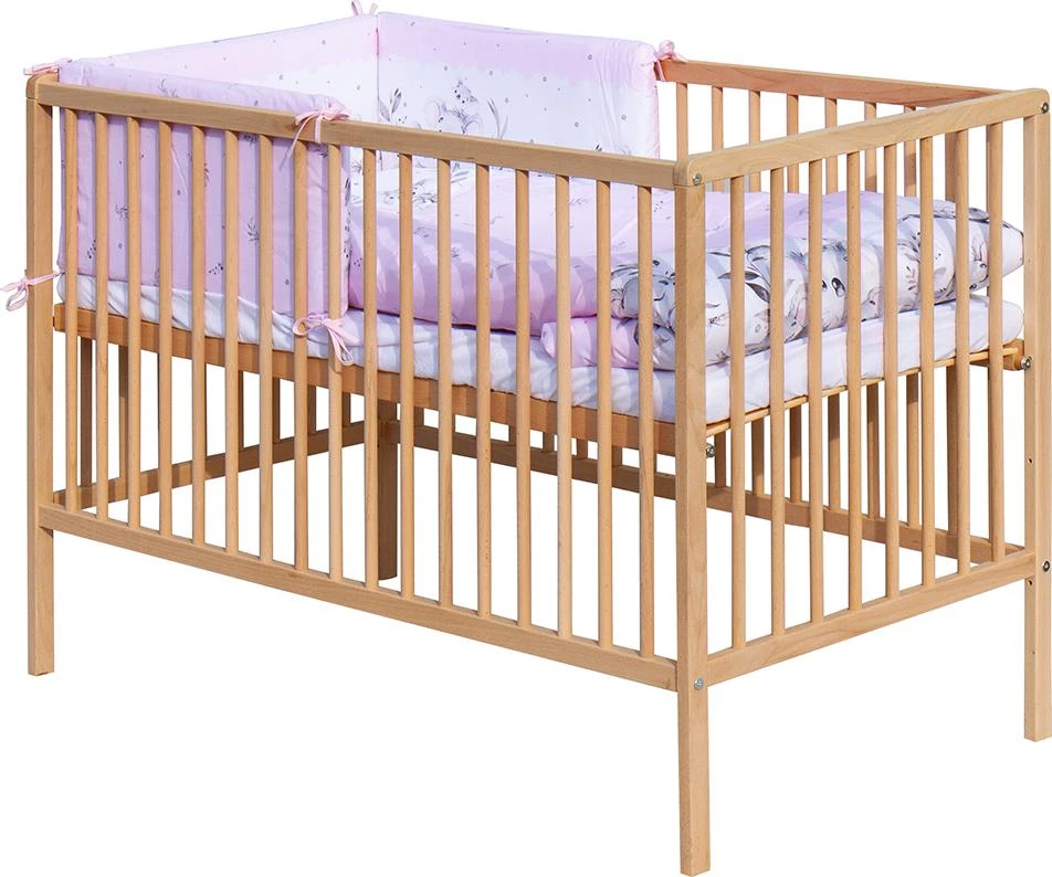 1. Detská drevená postieľka 120x60 cm - prírodný, masív buk, 3 vyberacie priečky, 3 polohy roštu, nohy sú predvŕtané pre možné nasadenie koliesok
