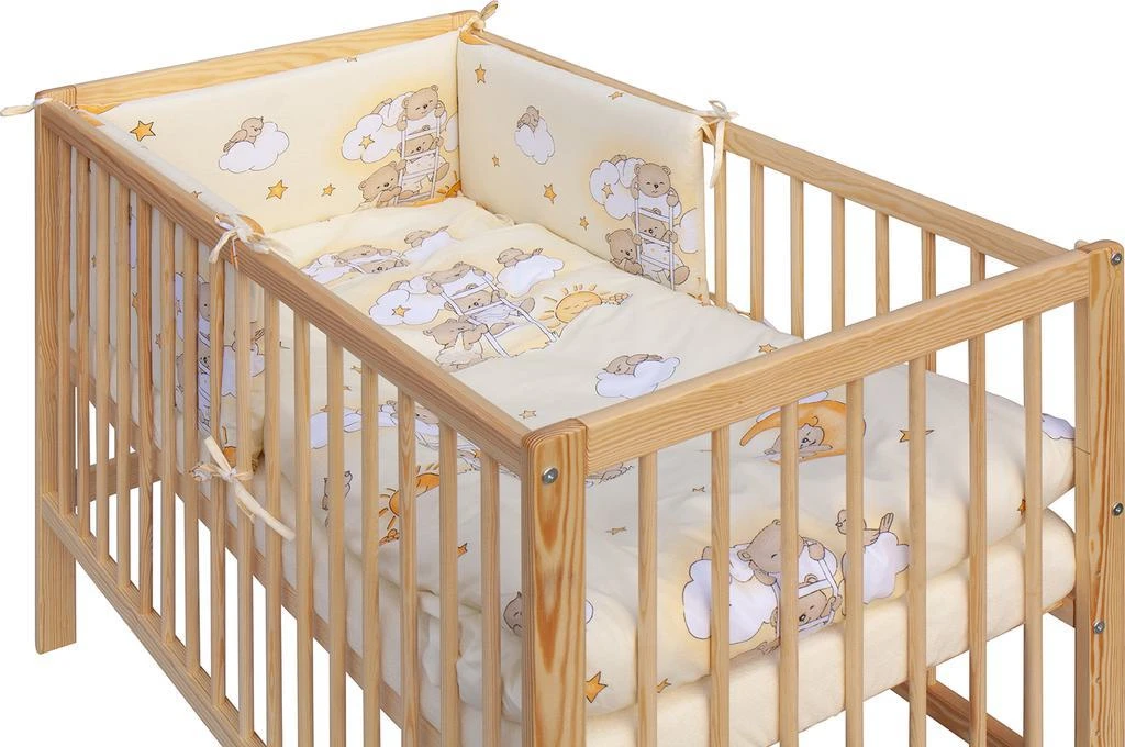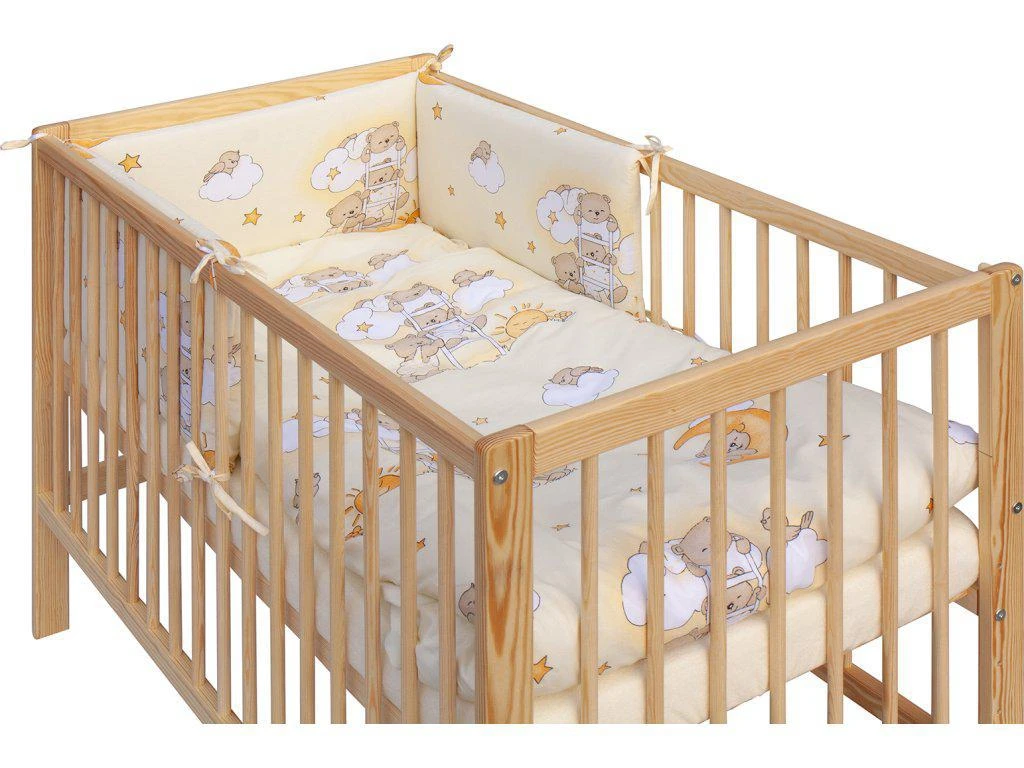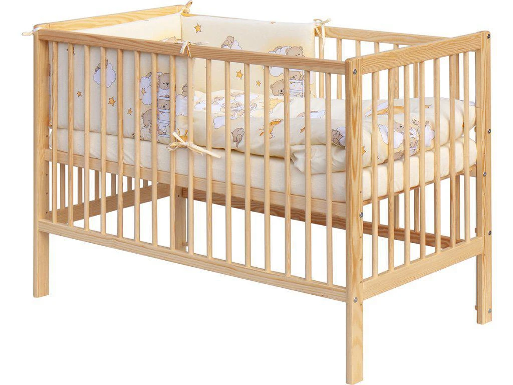 1. Detská drevená postieľka 120 x 60 cm - prírodný, masív borovice, 3 vyberacie priečky, 6 polohy roštu, nohy postieľky sú predvŕtané pre prípadné nasadenie koliesok