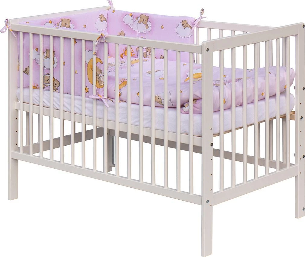 1. Detská drevená postieľka 120x60 cm - biela, masív borovice, 3 vyberacie priečky, 5 polôh roštu, nohy sú predvŕtané pre možné nasadenie koliesok