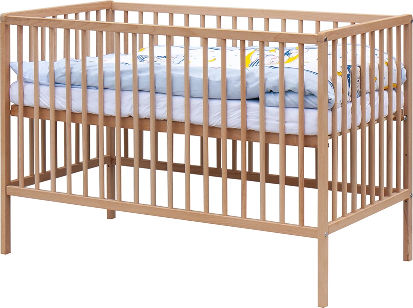 1. Detská drevená postieľka 120 x 60 cm - prírodný, masív buk, 3 vyberacie priečky, 2 polohy roštu,
