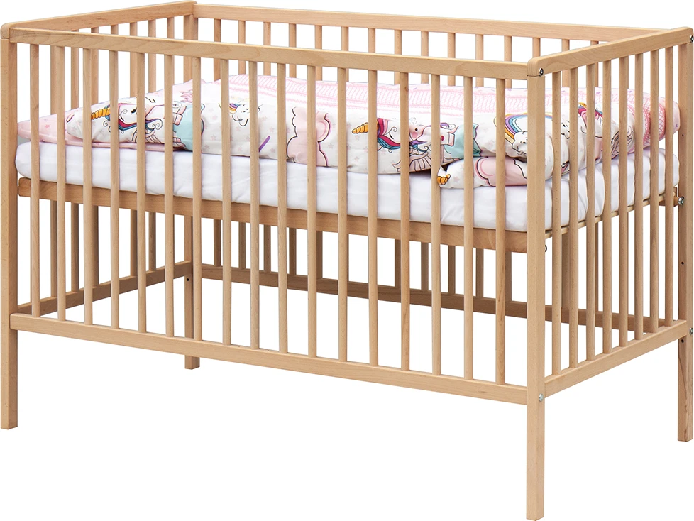1. Detská drevená postieľka 120 x 60 cm - prírodný, masív buk, 3 vyberacie priečky, 2 polohy roštu,