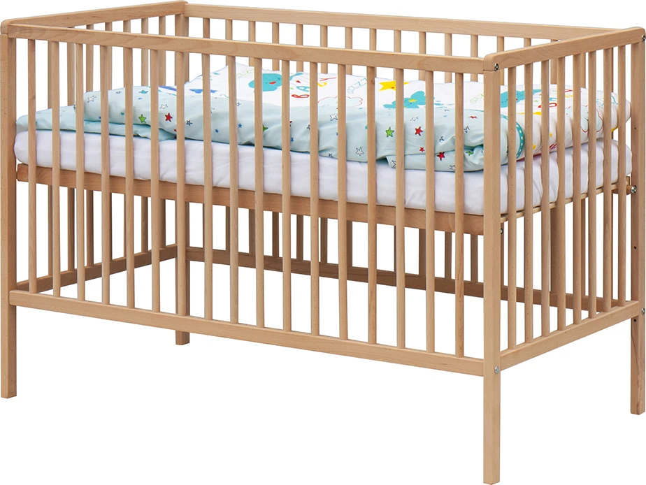 1. Detská drevená postieľka 120 x 60 cm - prírodný, masív buk, 3 vyberacie priečky, 2 polohy roštu,