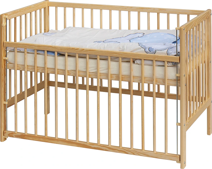 1. Detská drevená postieľka 120 x 60 cm - prírodný, masív borovice, sťahovací bok, 6 polôh roštu