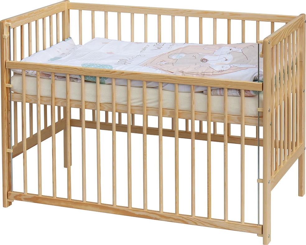 1. Detská drevená postieľka 120 x 60 cm - prírodný, masív borovice, sťahovací bok, 6 polôh roštu