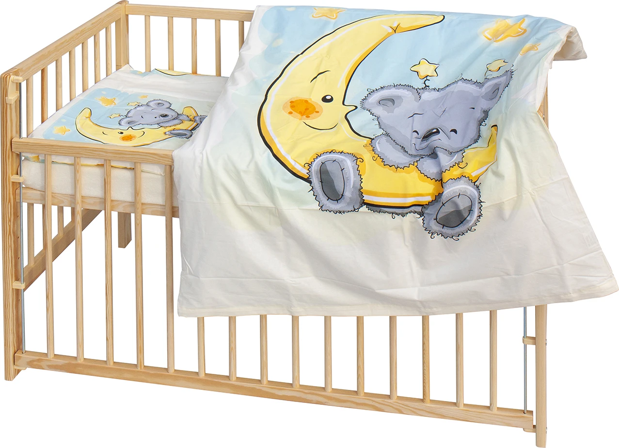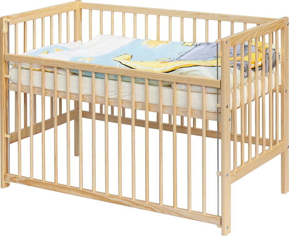 1. Detská drevená postieľka 120 x 60 cm - prírodný, masív borovice, sťahovací bok, 6 polôh roštu
