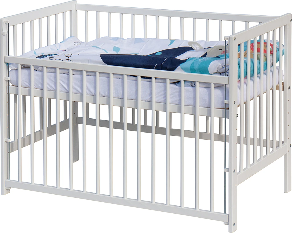 1. Detská drevená postieľka 120 x 60 cm - biela, masív borovice, sťahovací bok, 6 polôh roštu