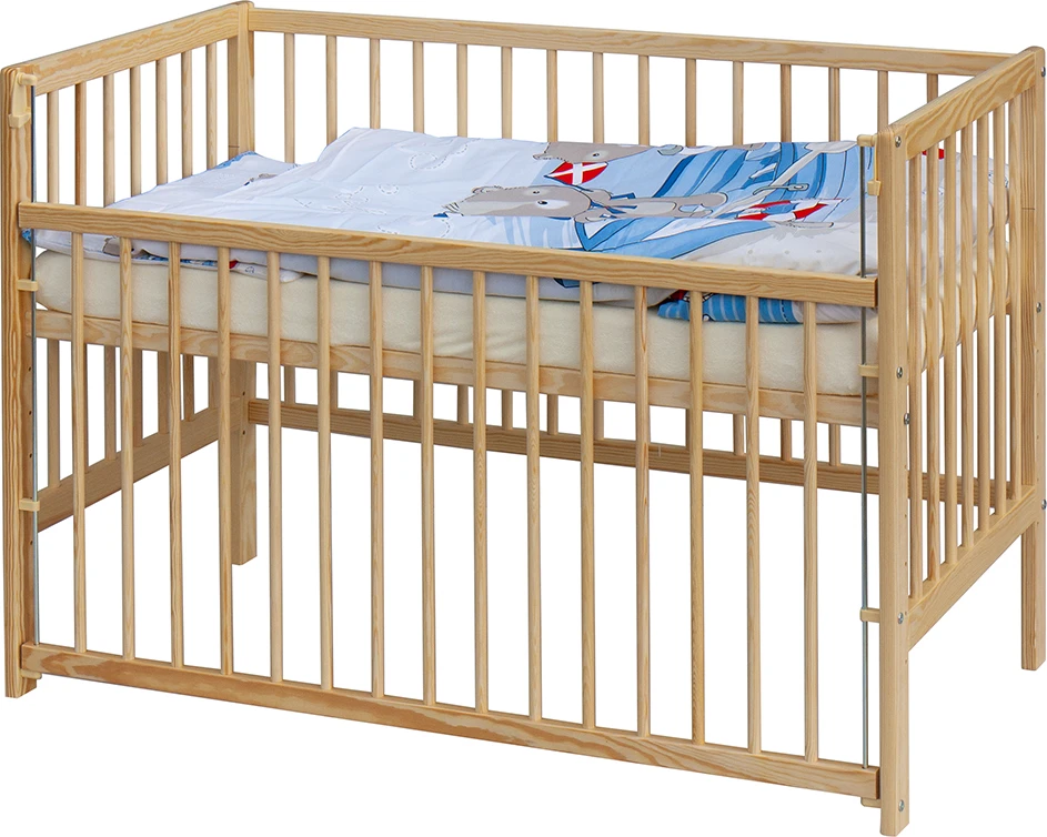 1. Detská drevená postieľka 120 x 60 cm - prírodný, masív borovice, sťahovací bok, 6 polôh roštu