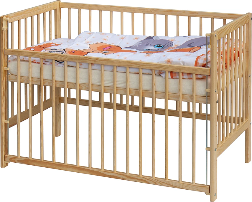 1. Detská drevená postieľka 120 x 60 cm - prírodný, masív borovice, sťahovací bok, 6 polôh roštu