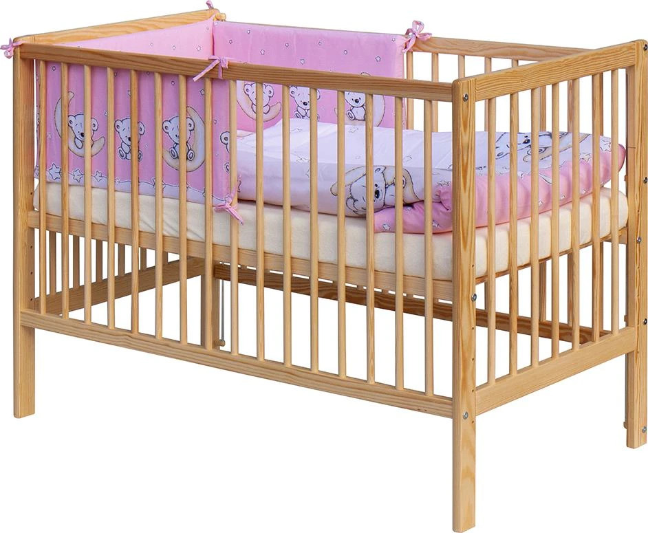 1. Detská drevená postieľka 120 x 60 cm - prírodný, masív borovice, 3 vyberacie priečky, 6 polohy roštu, nohy postieľky sú predvŕtané pre prípadné nasadenie koliesok