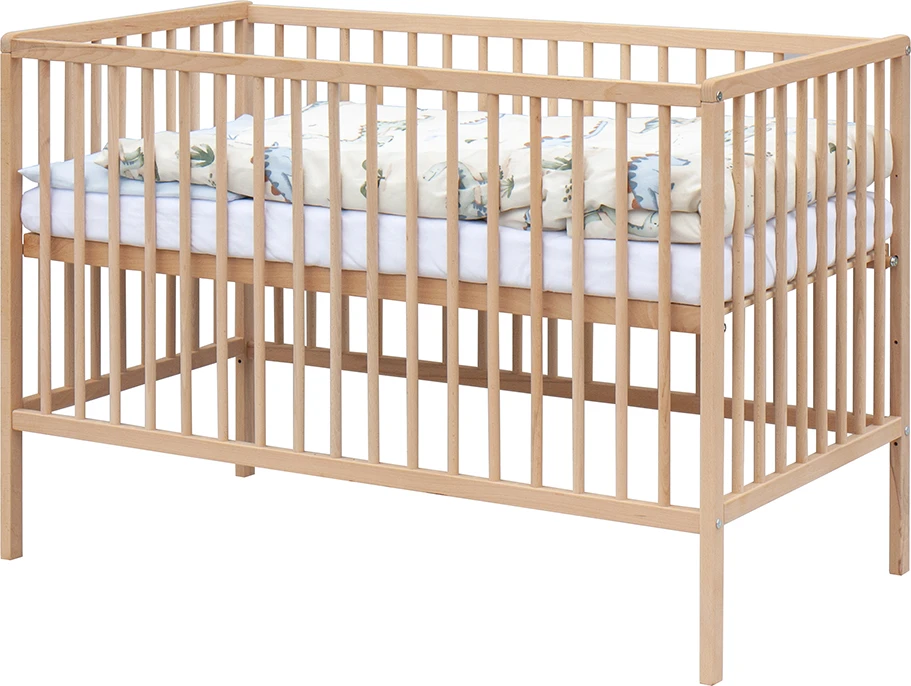 1. Detská drevená postieľka 120 x 60 cm - prírodný, masív buk, 3 vyberacie priečky, 2 polohy roštu,