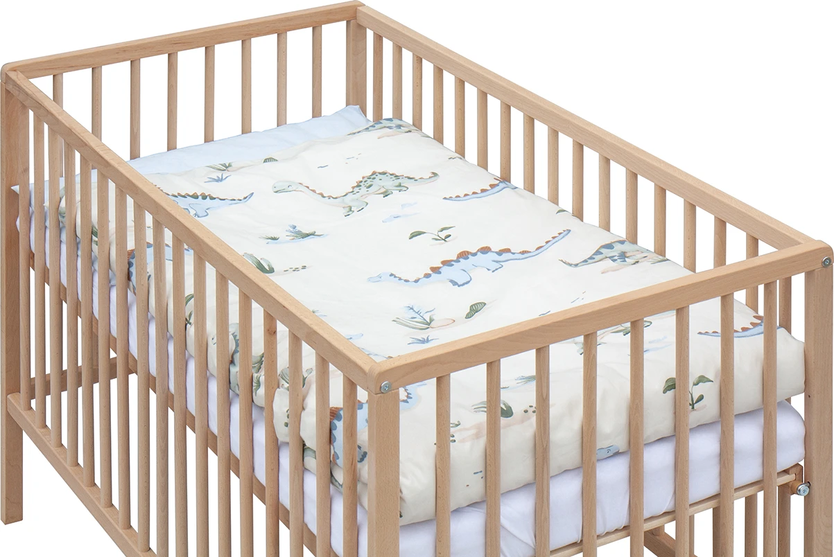 Postieľka ponúka dve polohy roštu a tri vyberacie priečky, ktoré uľahčujú manipuláciu aj prispôsobenie podľa rastu dieťaťa. Súčasťou kompletu je aj matrac a kompletná posteľná výbava, takže máte všetko potrebné prehľadne v jednom balení.