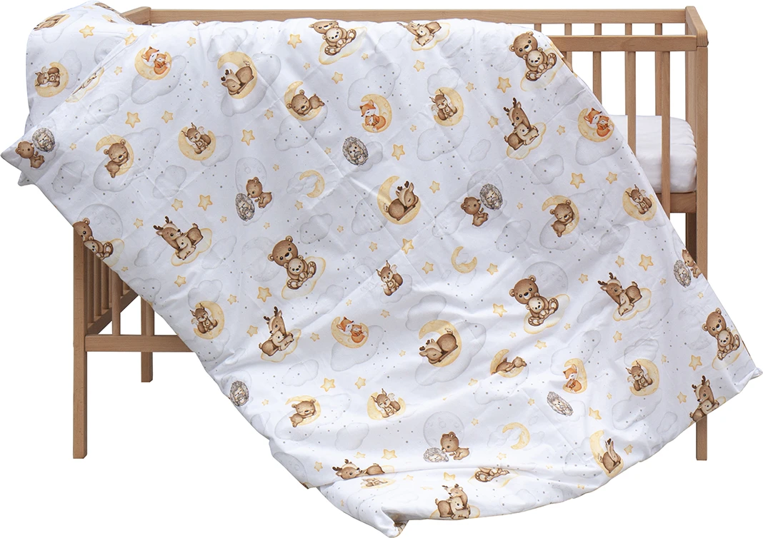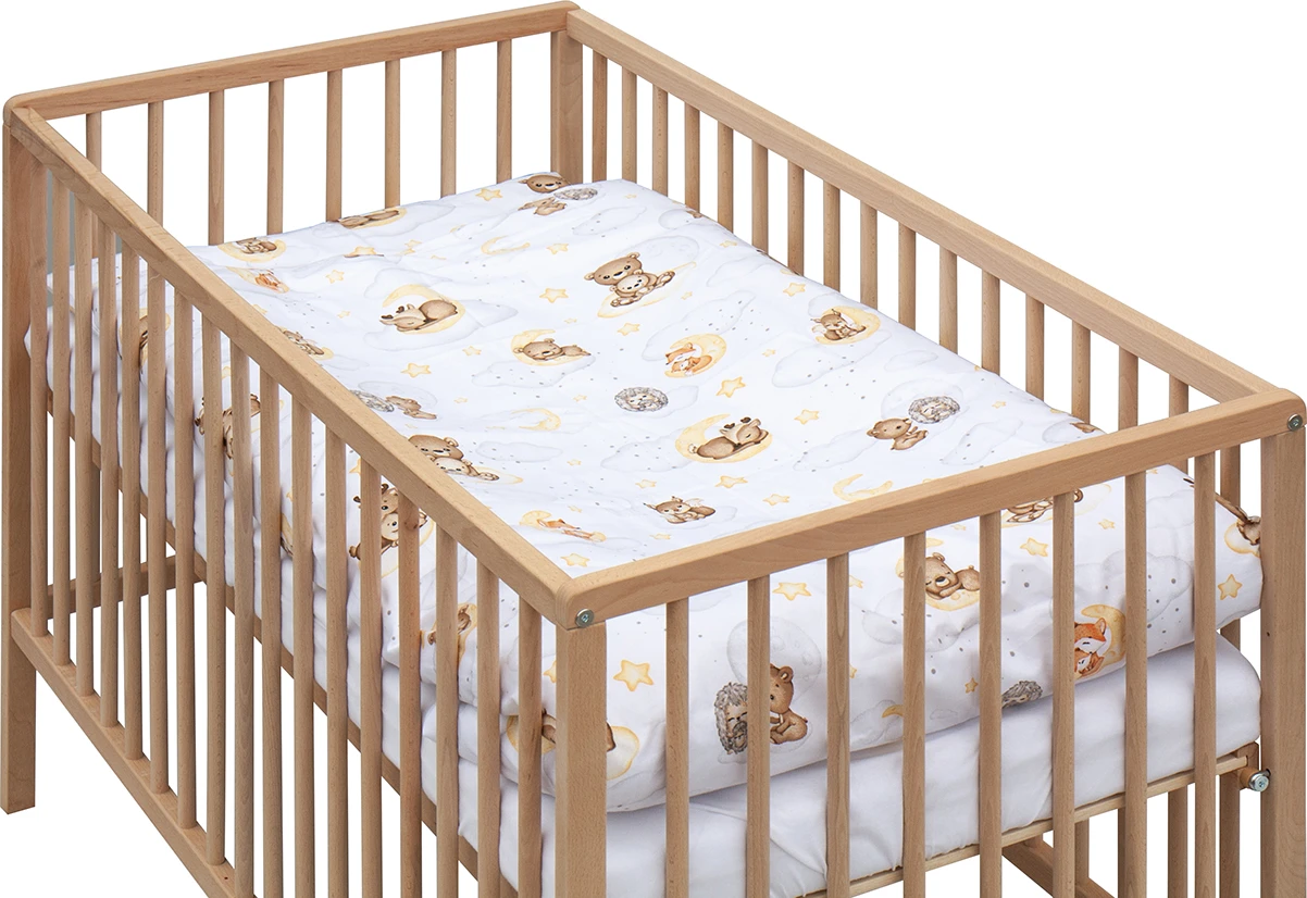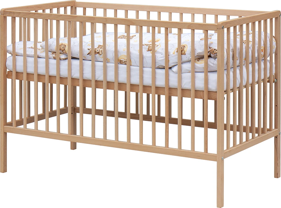 Postieľka disponuje dvoma polohami roštu a tromi vyberacími priečkami, ktoré uľahčujú každodennú starostlivosť aj prispôsobenie podľa rastu dieťaťa. Súčasťou kompletu je aj matrac a kompletná posteľná výbava, takže máte všetko pripravené v jednom balení bez starostí.