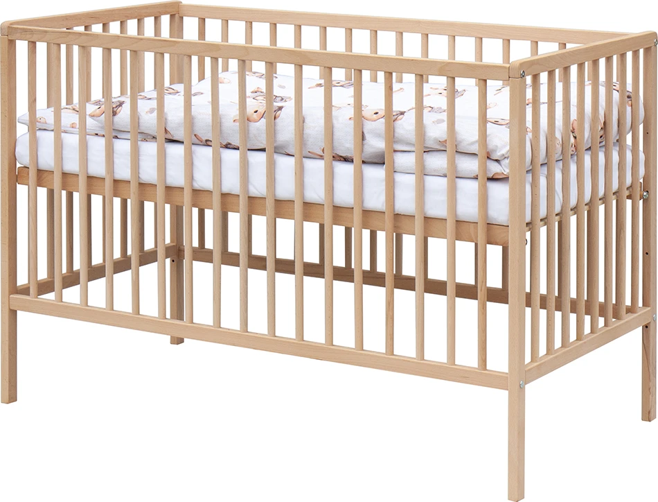 1. Detská drevená postieľka 120 x 60 cm - prírodný, masív buk, 3 vyberacie priečky, 2 polohy roštu,
