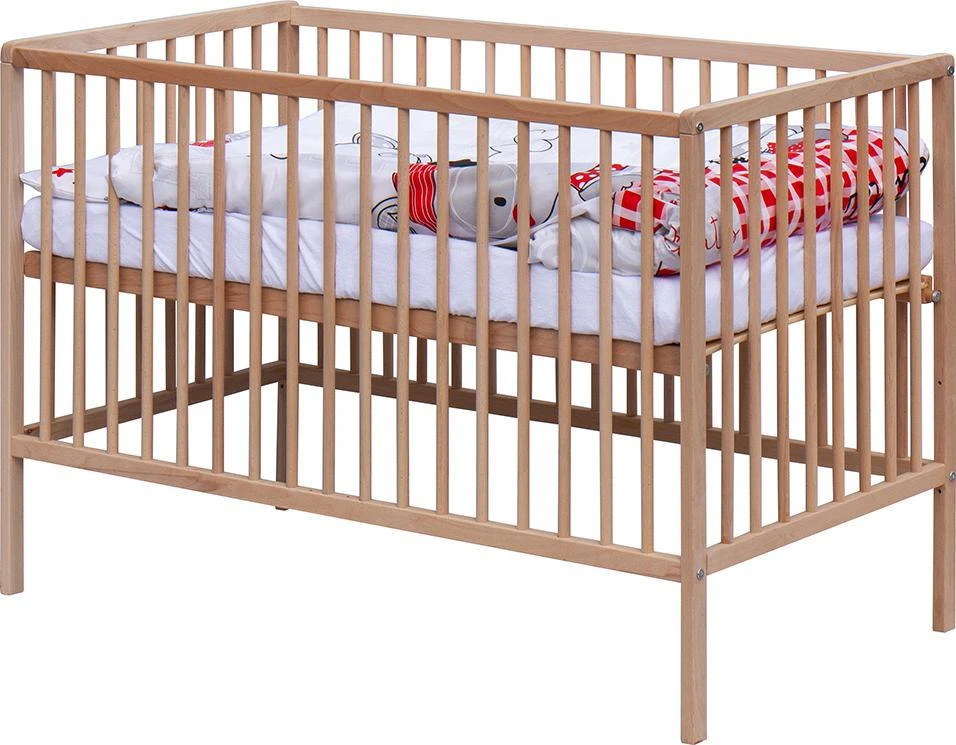 1. Detská drevená postieľka 120 x 60 cm - prírodný, masív borovice, 3 vyberacie priečky, 3 polohy roštu,