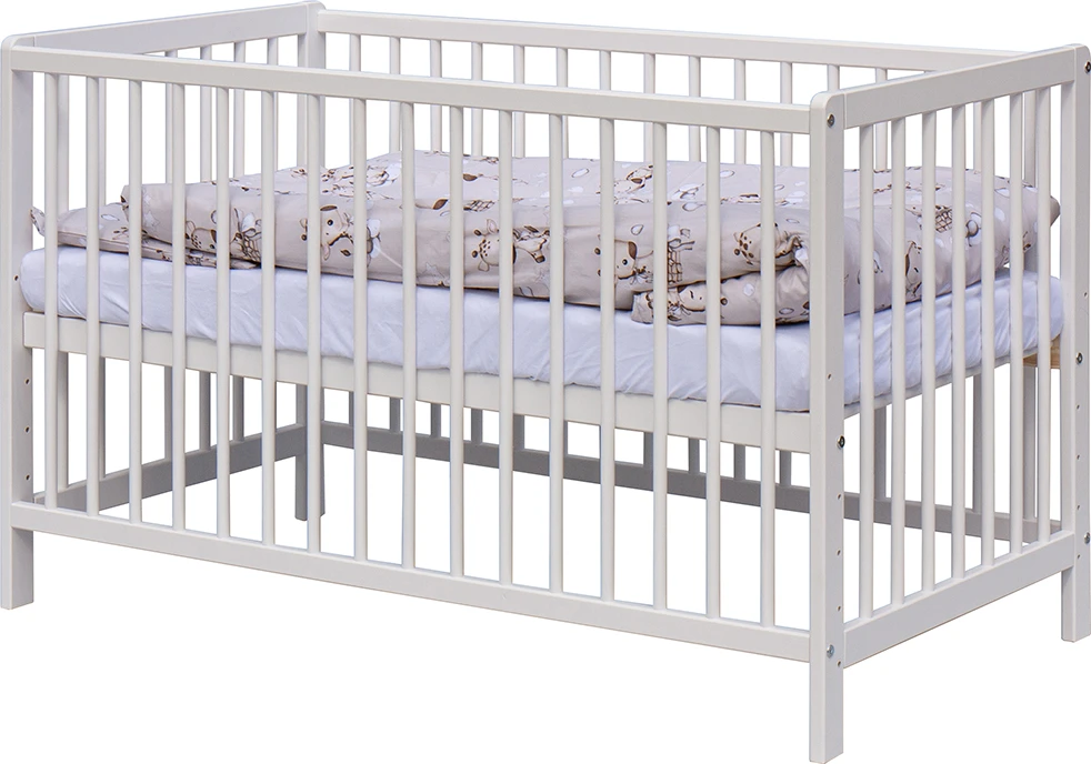1. Detská drevená postieľka 120x60 cm - biela, masív borovice, 3 vyberacie priečky, 5 polôh roštu