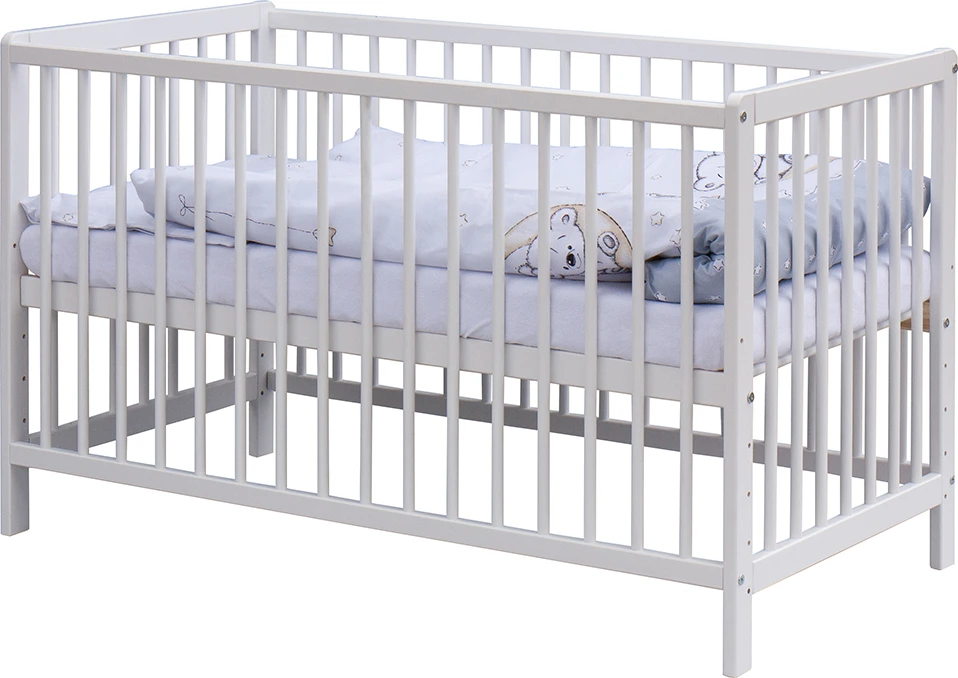 1. Detská drevená postieľka 120x60 cm - biela, masív borovice, 3 vyberacie priečky, 5 polôh roštu