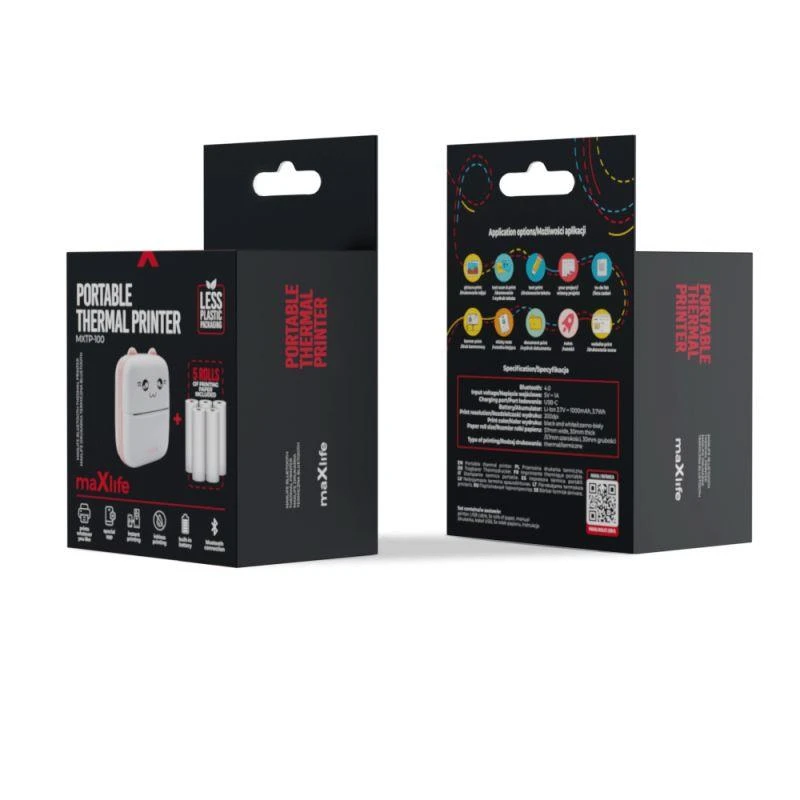 Termotlačiareň Maxlife Bluetooth je praktická prenosná tlačiareň, ktorá je ideálna pre tlač rôznych projektov - od fotografií po výkresy, poznámky, štítky, samolepky a ďalšie. Jednou z jej kľúčových funkcií je termálna tlač. Dodáva sa s piatimi rolkami termopapiera, čo vám umožní tlačiť bez nutnosti výmeny atramentu.