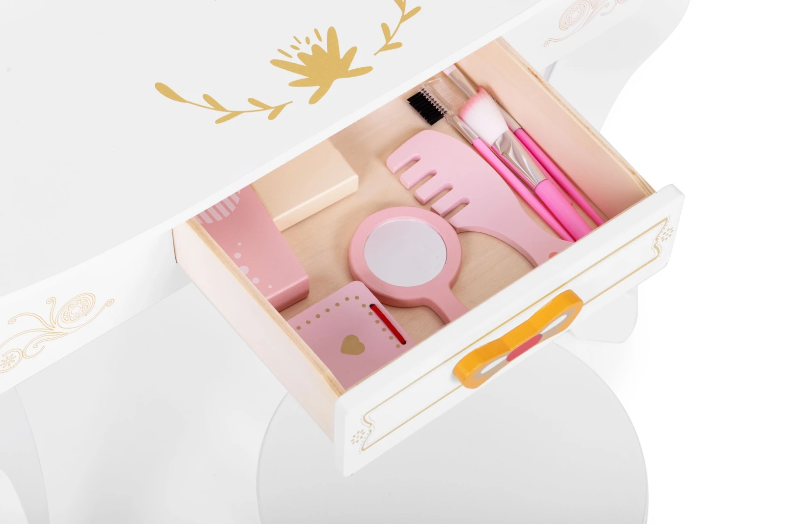 Tento toaletný stolík obsahuje množstvo doplnkov, ktoré potešia každú malú dámu. Deti sa môžu hravou formou vžiť do role vizážistky, modelky alebo princeznej. Pri hraní rozvíjajú jemnú motoriku, trpezlivosť aj kreativitu a zároveň sa zoznamujú so základmi líčenia. Toaletka poskytuje priestor nielen pre hru, ale aj pre rozvoj fantázie a zmyslu pre poriadok.