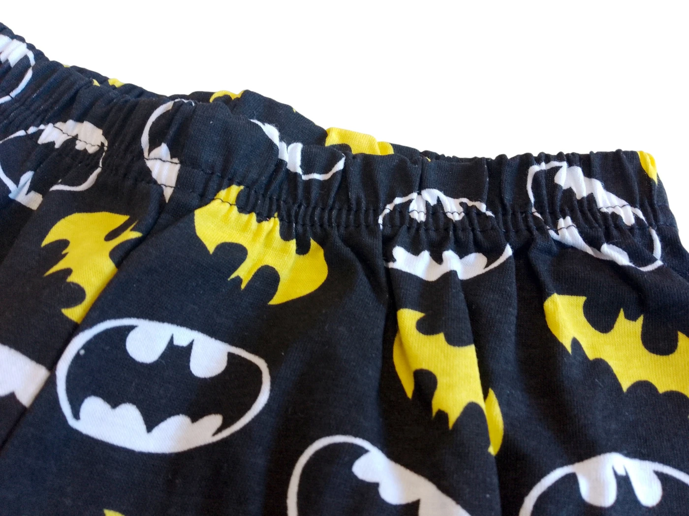 Nohavice sú navrhnuté v čiernom prevedení s celoplošnou potlačou netopierieho loga v typických žlto-čiernych farbách. Vďaka elastickému pásu perfektne sedí a neškrtí, čo zaisťuje pohodlie pri nosení. Nohavice sú zakončené modrými nápletmi, ktoré ladia s detailmi na tričku a zabraňujú vyhrňovaniu počas spánku. Materiál je príjemný na dotyk a zaisťuje dostatočnú priedušnosť pre pokojný nočný odpočinok.