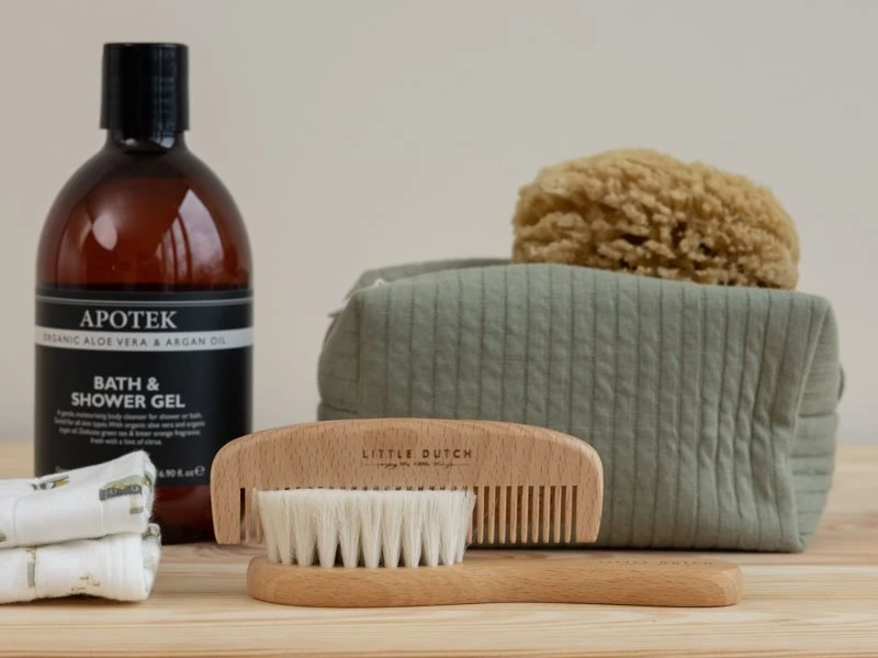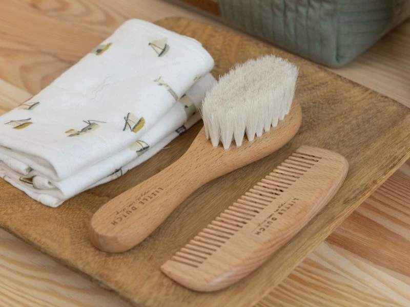 Súprava pre každodennú starostlivosť o detské vlásky obsahuje drevenú kefu s mäkkými štetinami a hrebeň so širokými zubami, ktoré sú šetrné k citlivej pokožke hlavy bábätka.