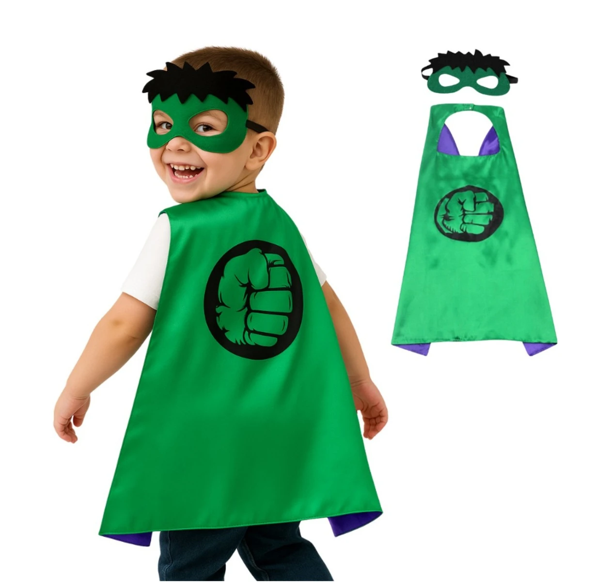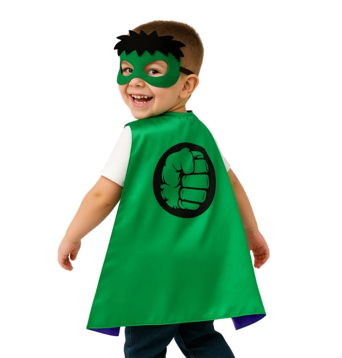 Tento štýlový set sa skladá z lesklého zeleného plášťa s ikonickým motívom päste Hulka a doplnkovej masky s čiernymi vlasmi a zeleným okrajom okolo očí. Deti sa behom okamihu premenia na neohrozeného Avengera a stanú sa hviezdou každého karnevalu alebo narodeninovej oslavy.