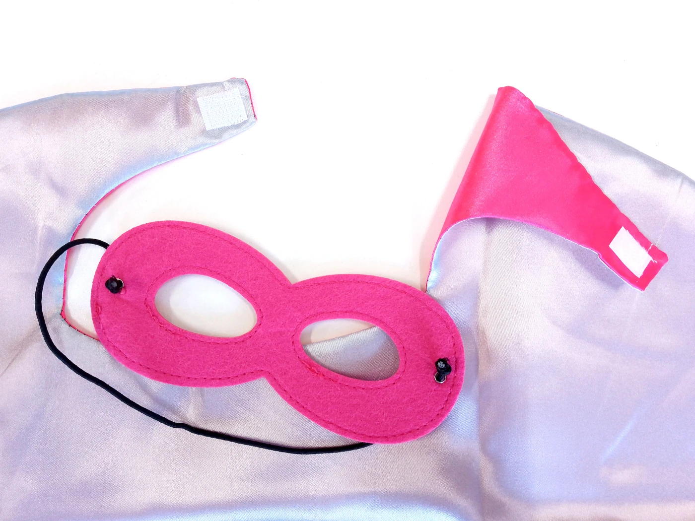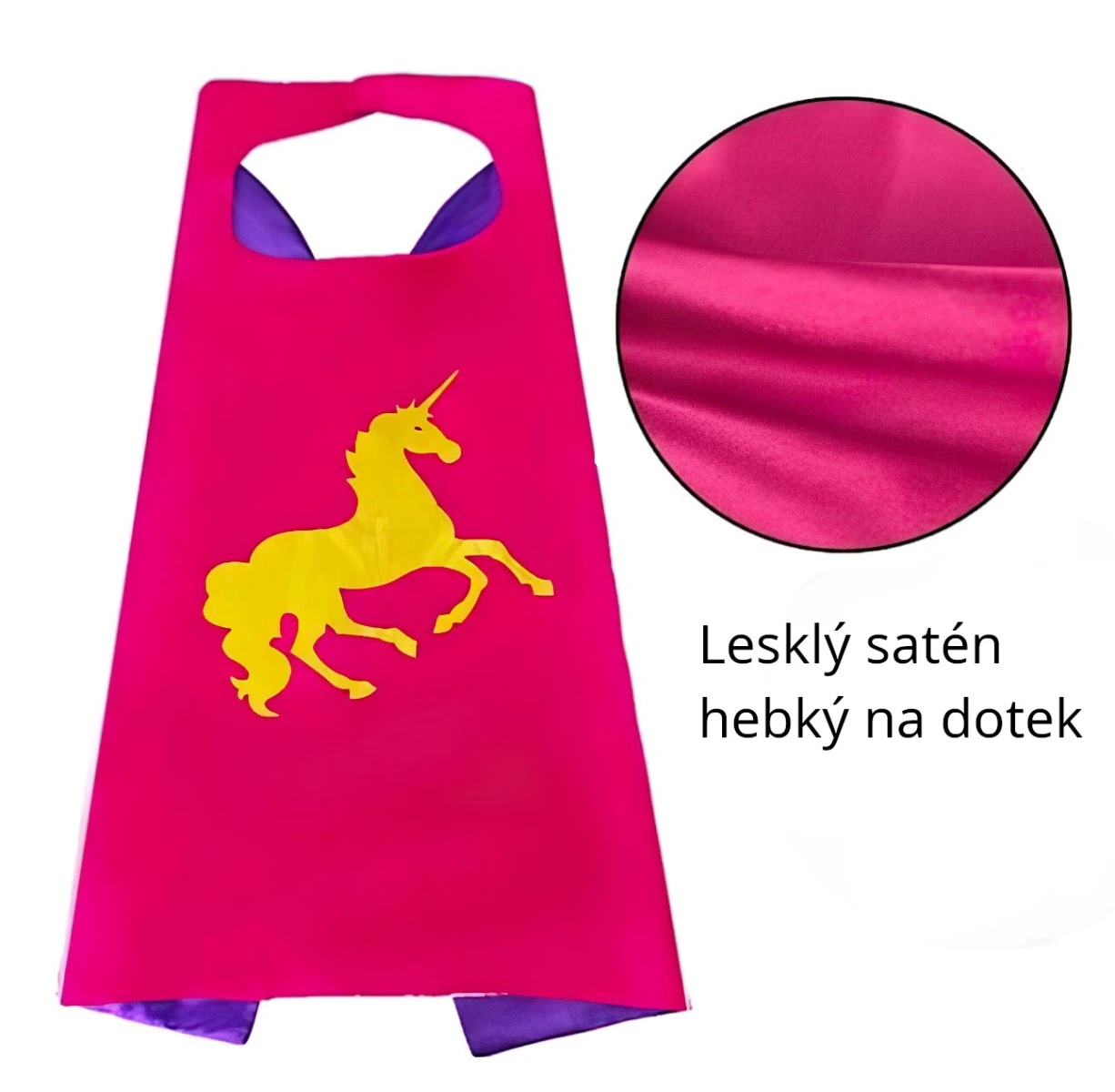 Plášť je vyrobený z jemného, lesklého saténového materiálu, ktorý je príjemný na dotyk a zároveň odolný voči bežnému noseniu. Vnútorná strana je v kontrastnej fialovej farbe, čo dodáva kostýmu ešte viac kúzelného nádychu. Zapínanie na suchý zips umožňuje jednoduché obliekanie a vyzliekanie bez pomoci rodičov.