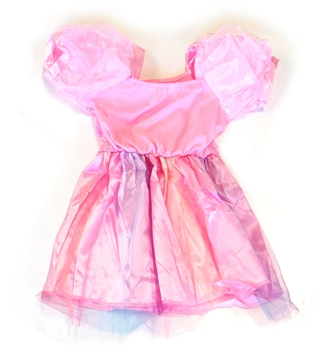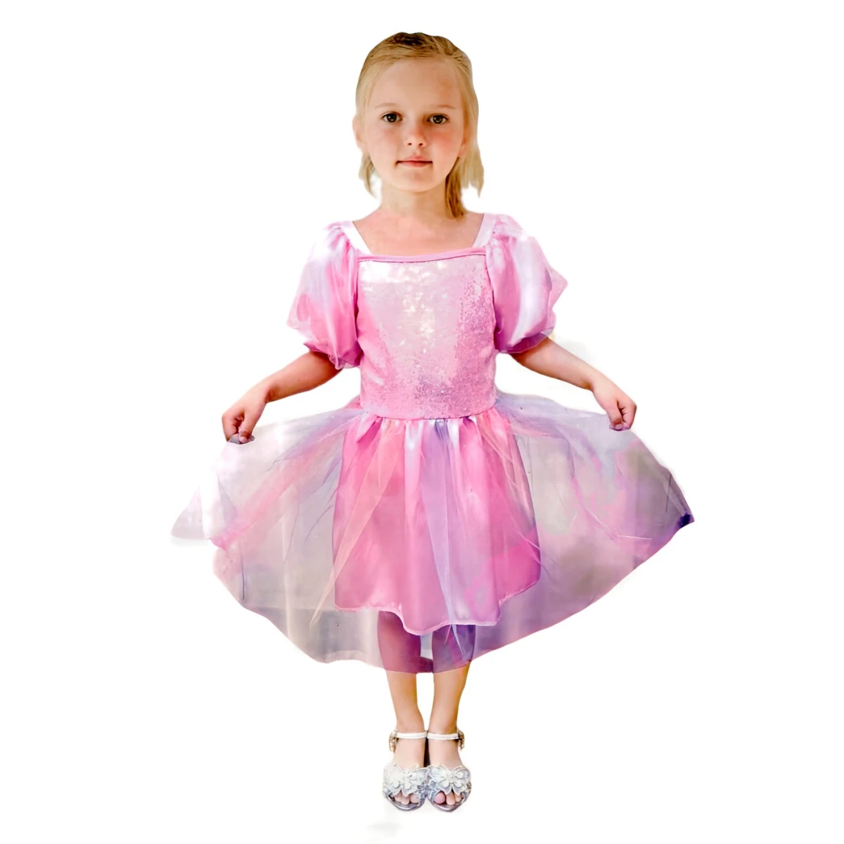Kostým sa skladá z ružových šiat s trblietavým živôtikom a nadýchanými krátkymi rukávmi. Sukňa je bohato vrstvená, tvorená kombináciou saténu a ľahkého tylu v ružových a fialových odtieňoch, ktoré pri pohybe krásne vyniknú. Celý vzhľad pôsobí ľahko a elegantne, zároveň však zostáva pohodlný a hravý.