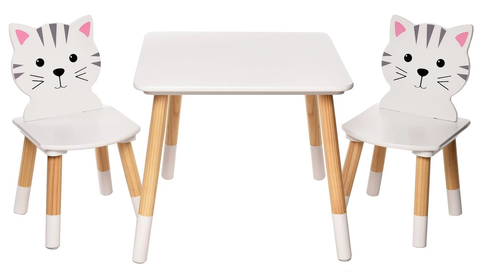 Nádherný detský stôl v bielom prevedení so stoličkami s motívom mačičiek. Stolček je ideálnym miestom na hranie, maľovanie, občerstvenie alebo na posedenie s kamarátmi. Originálny doplnok do detskej izby, praktický, prispôsobený detským potrebám. Nábytok je stabilný, ľahko sa čistí.