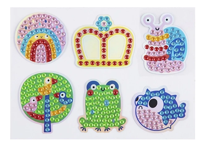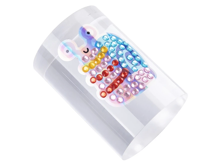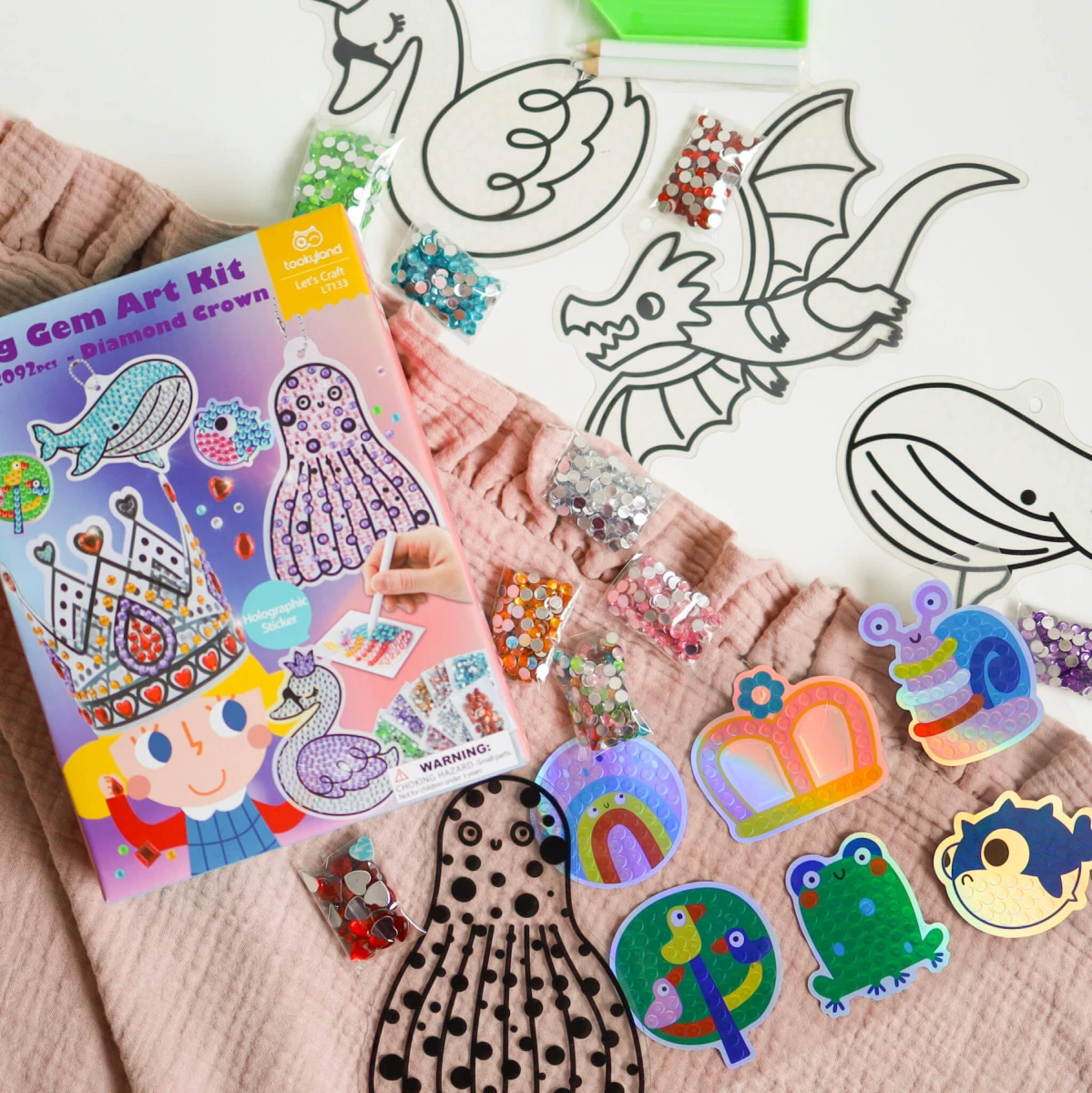 Deti si vďaka trblietavým nalepovacím kamienkom vytvoria 1 korunku, 4 veľké prívesky na kľúče či batoh aj 6 rozkošných trblietavých nálepiek.
