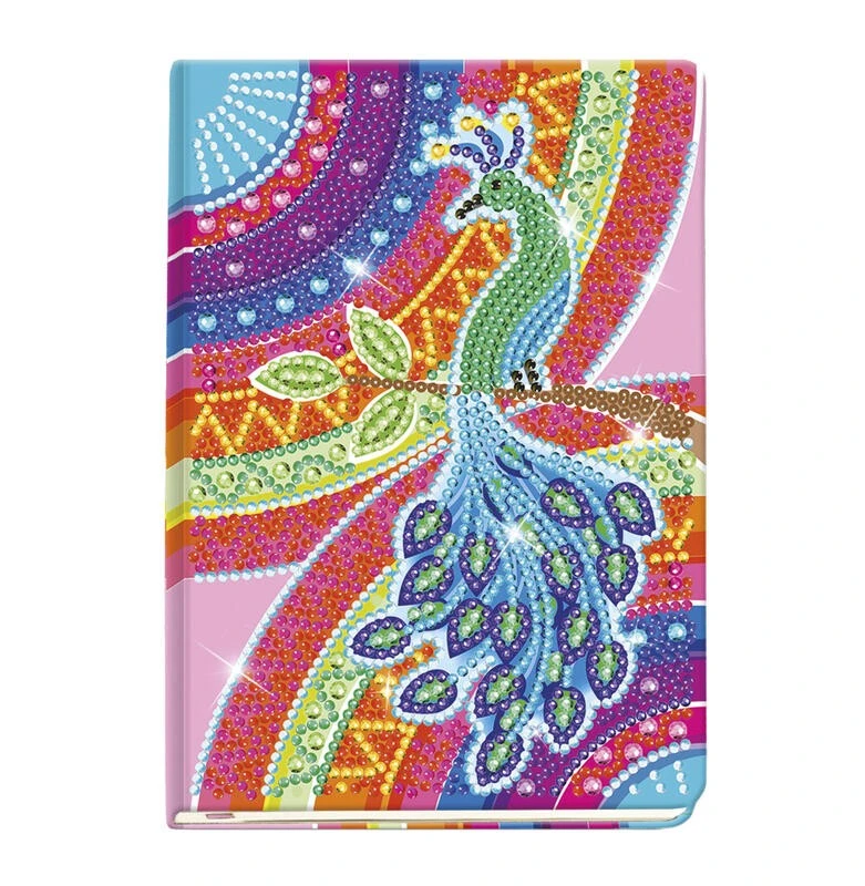 Diamantový denník Páv ponúka originálne spojenie kreatívneho tvorenia a elegantného dizajnu, vďaka ktorému si deti vytvoria jedinečný denník ozdobený trblietavými kamienkami pre zápisky svojich myšlienok a snov.