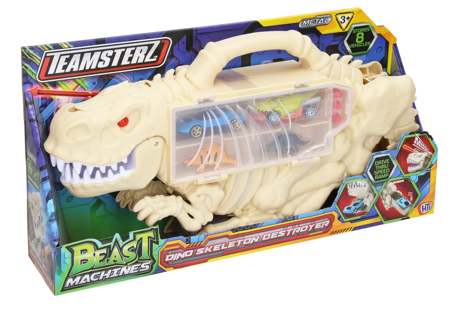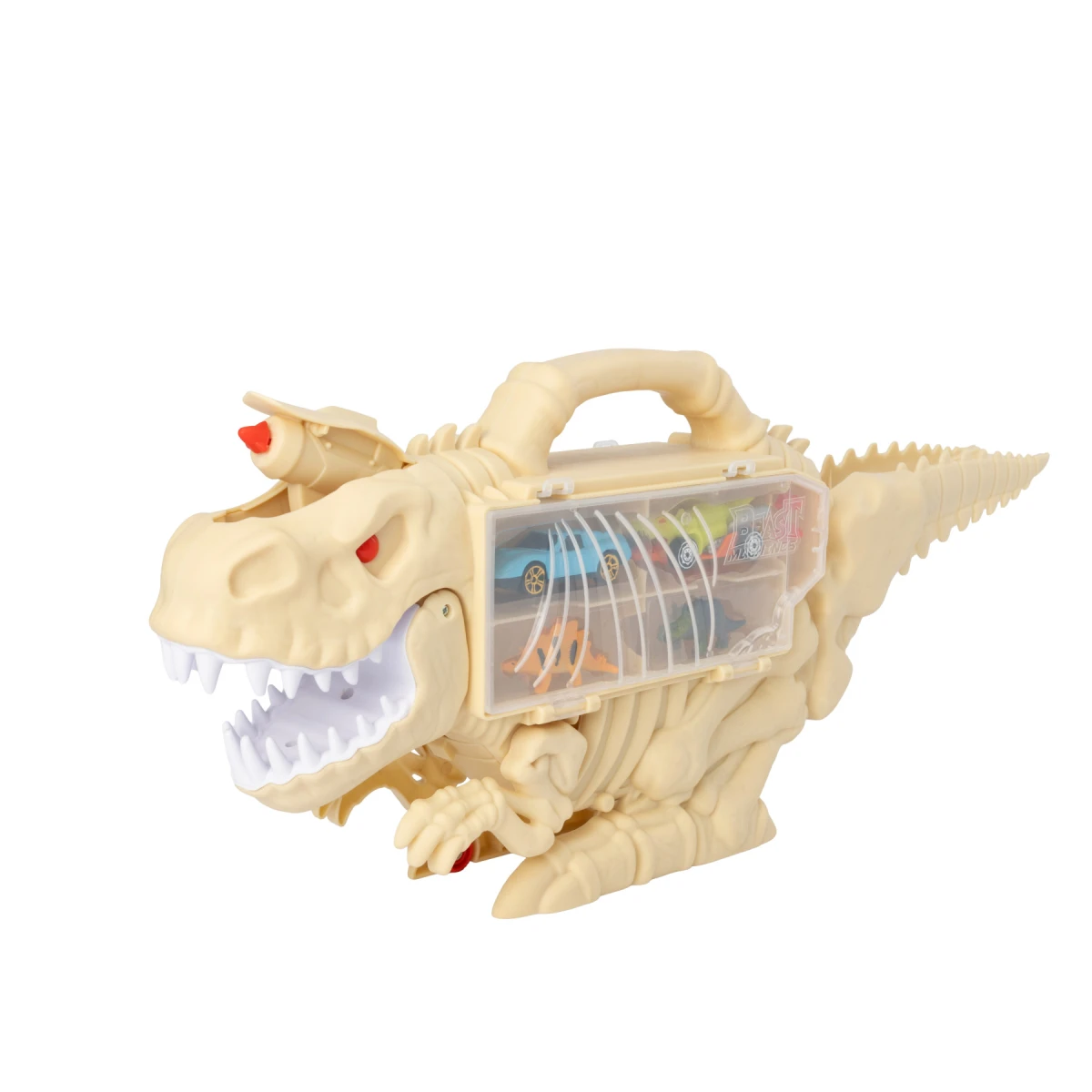 Dinosaurus má otváracie bočné časti s priehradkami, kam je možné autíčka pohodlne uložiť. Zdvíhací chvost slúži ako autodráha – dieťa umiestni autíčko na jej začiatok, to prejde celým telom dinosaura a vyjde prednou časťou pod jeho hlavou. Na hlave nechýba odklápací priestor pre raketu, ktorú je možné vystreliť stlačením tlačidla.