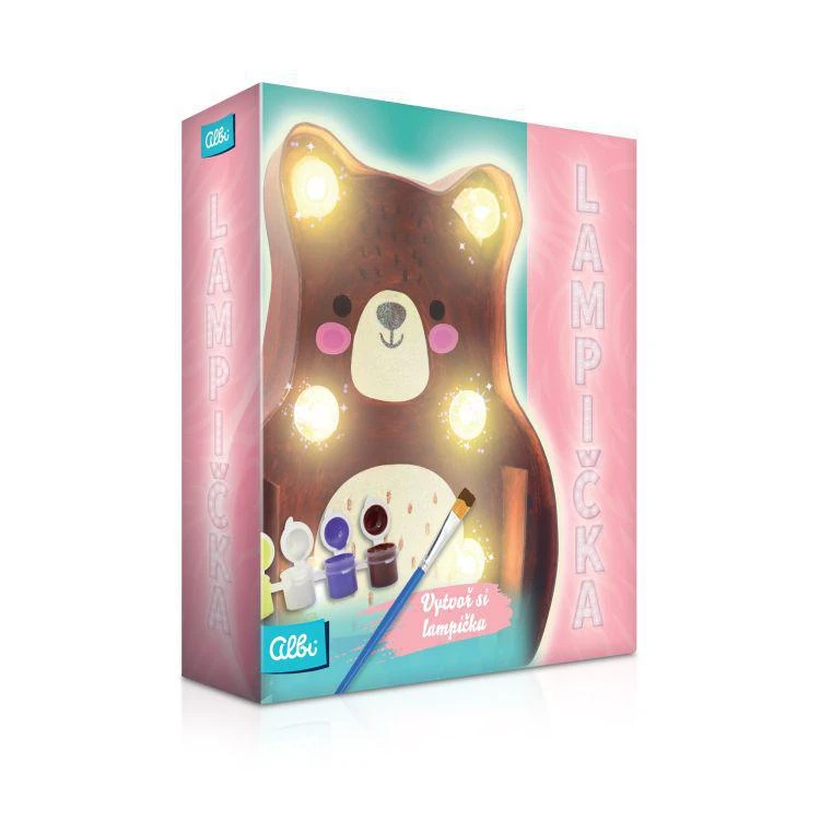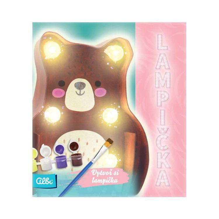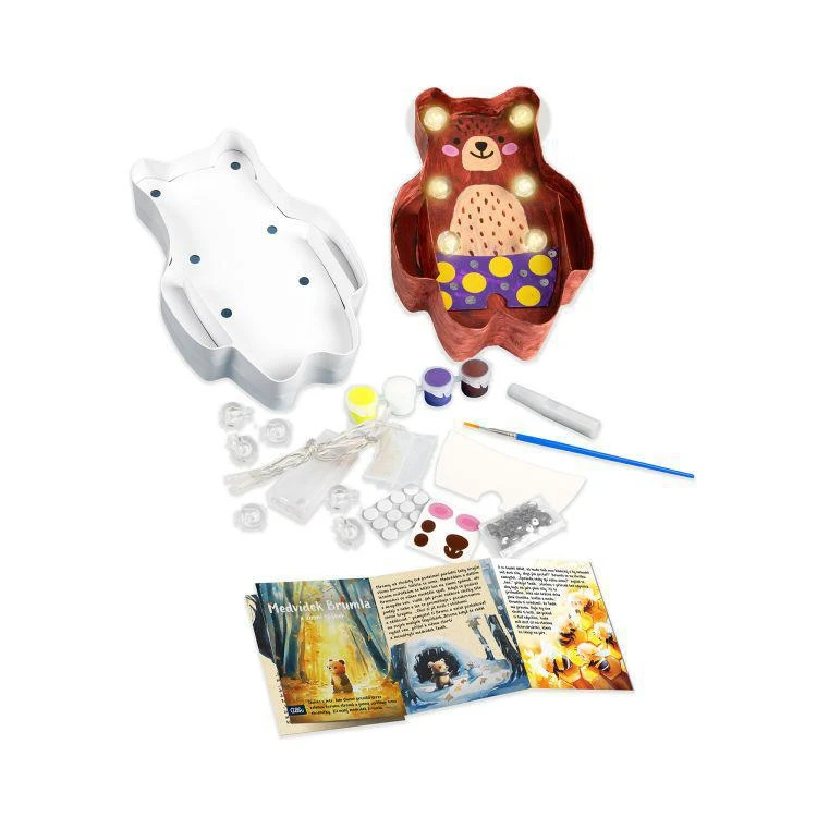 Balenie obsahuje: kartón v tvare medvedíka, 4 kalíšky akrylových farieb, 1 štetec, trblietkové lepidlo, svietiaca reťaz s LED diódami, 6 plastových baniek na žiarovky, 9 obojstranne lepiacich vankúšikov, trblietavé kolieska, kartónový základ pre 2 1 samolepku ňufáku.
