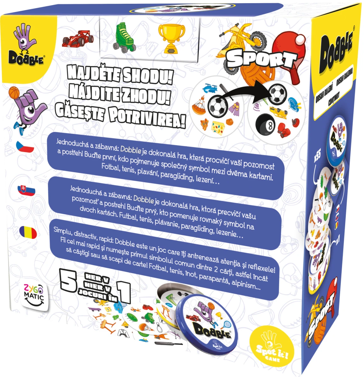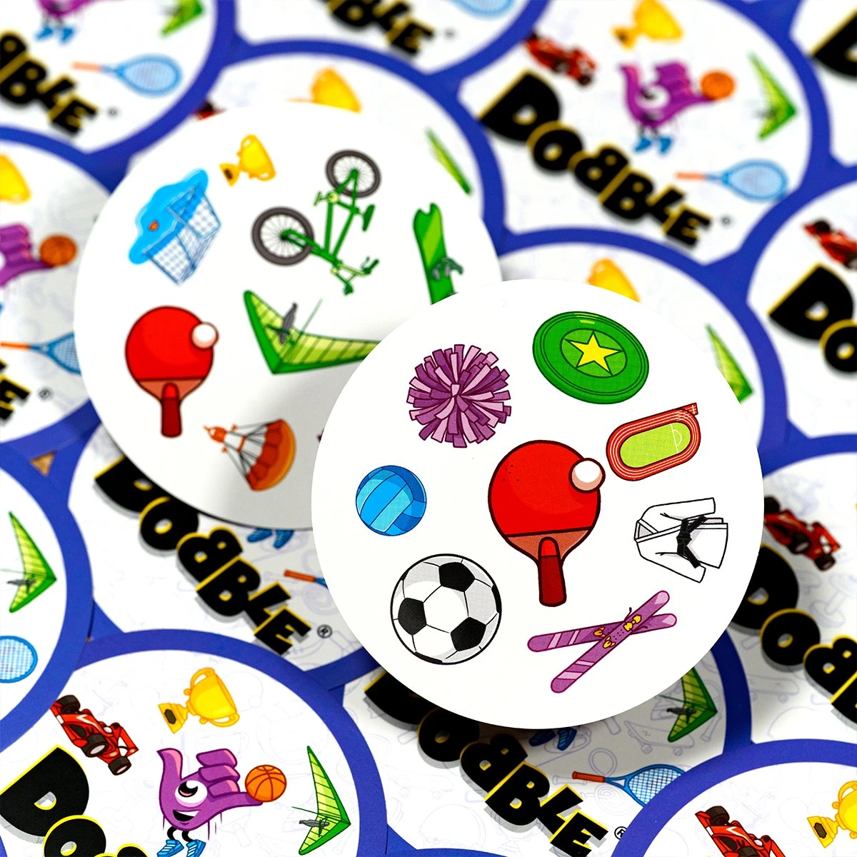 Postrehový bestseller Dobble vstupuje do sveta športu! Na každej karte nájdete 8 tematických obrázkov. Máte radi šport? Buďte prvý, kto pomenuje spoločný symbol medzi dvoma kartami. Futbal, tenis, plávanie, paragliding, lezenie…