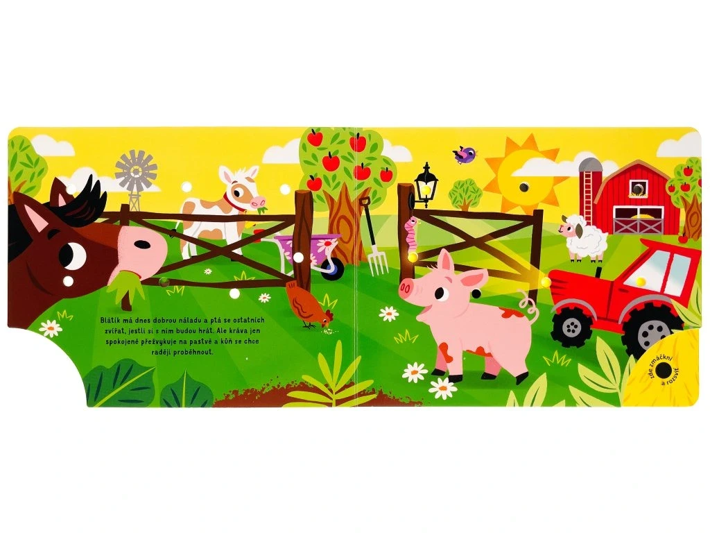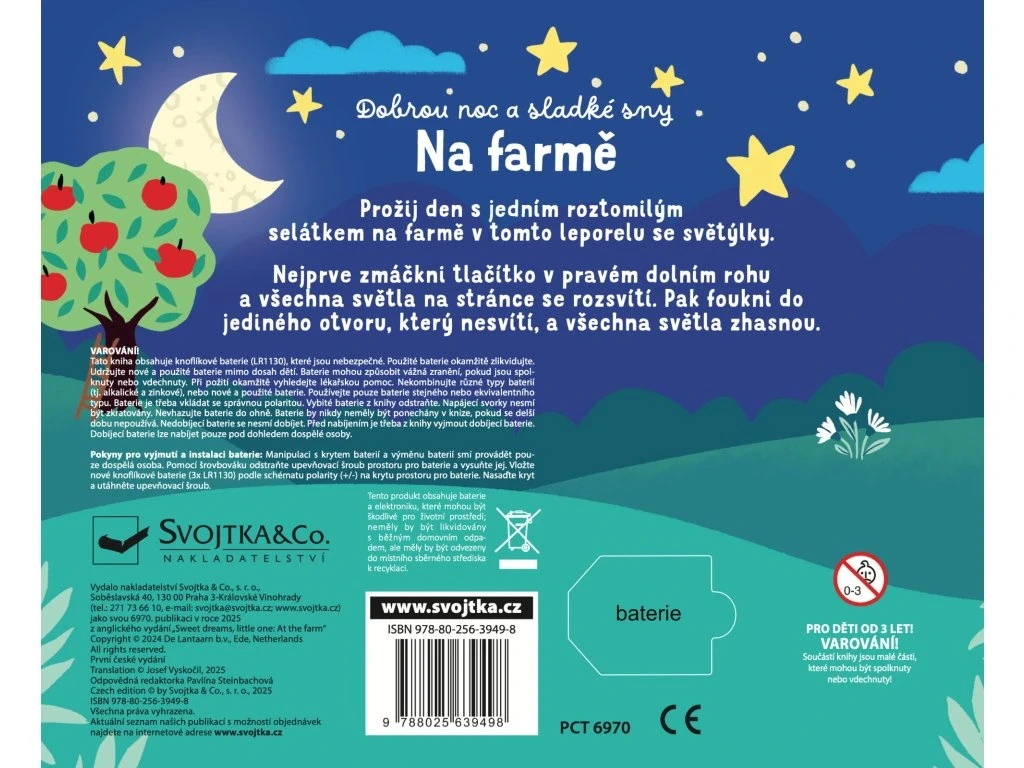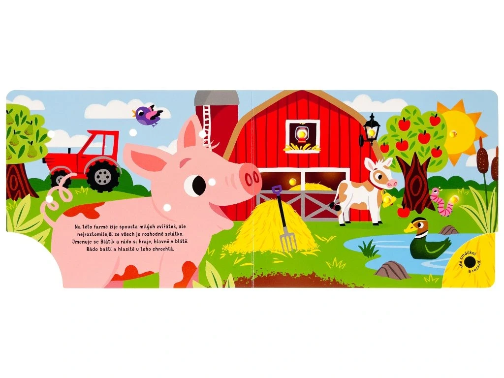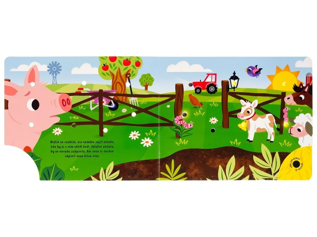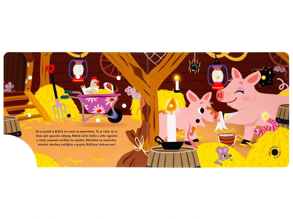 Prežite deň s jedným roztomilým prasiatkom na farme v tomto leporele so svetielkami. Prasiatko sa rado hrá s ostatnými zvieratami, ale po celom dni je unavené. Ulož ho do postieľky a fúknutím zhasni svetielka. Ako kniha funguje? Najprv stlač tlačidlo v pravom dolnom rohu a všetky svetlá na stránke sa rozsvietia. Potom fúkni do jediného otvoru, ktorý nesvieti, a všetky svetlá zhasnú. Ideálna knižka pred spaním.