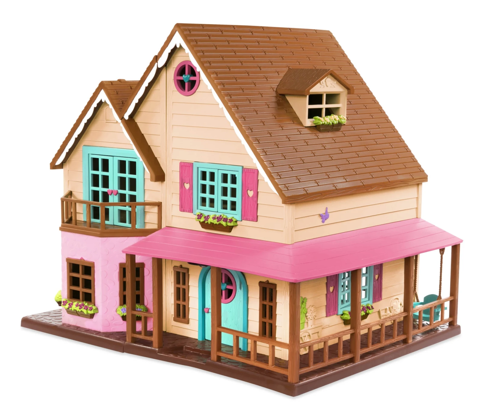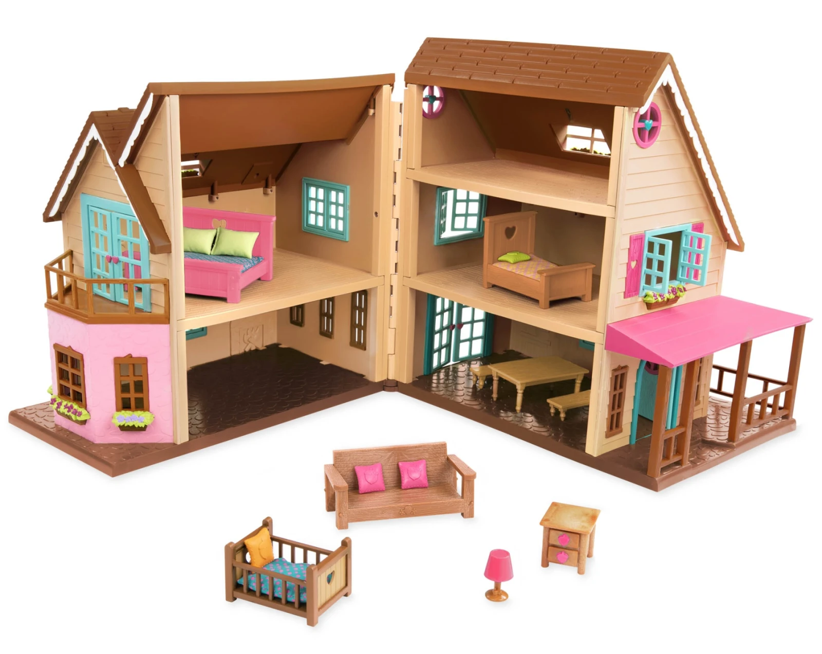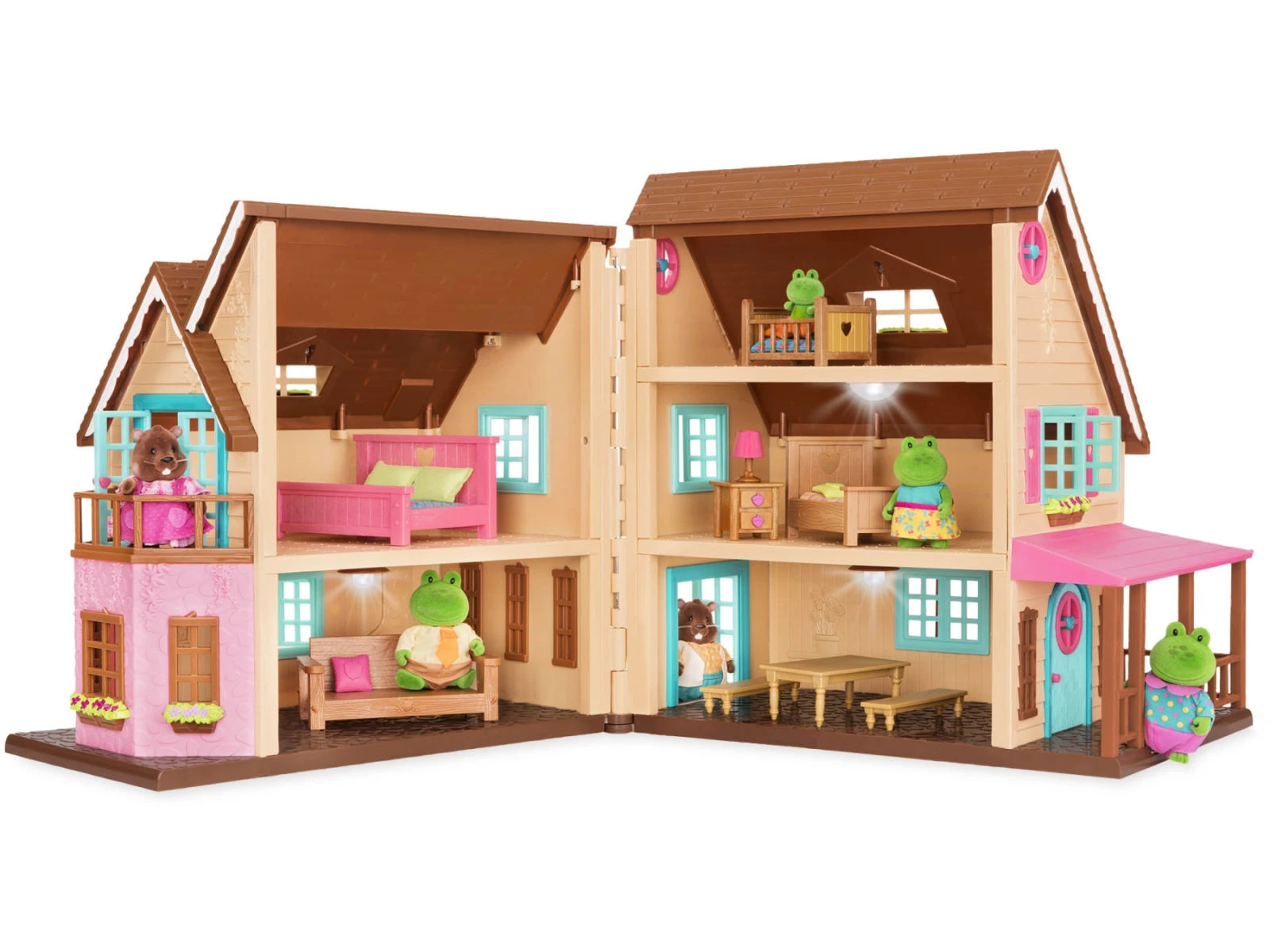 Otvárací 3-poschodový domček Hillside Cottage poskytuje nádherné bývanie postavičkám zvieratiek Li'l Woodzeez. Vnútri nájdete nábytok vrátane postelí pre celú rodinu, stola so stoličkami, pohovky atď.