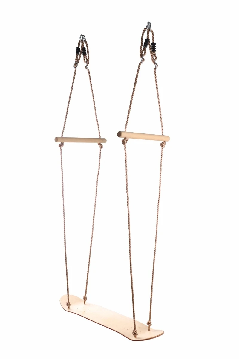 Drevená hojdačka skateboard s madlami a 2 karabínami na zavesenie. Nevyhnutný pomocník pre objaviteľov vonkajšej zábavy na modernom detskom ihrisku.