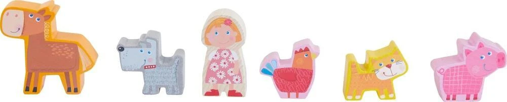 Drevená farma na hranie obsahuje dievča a chlapcov (obojstranná figúrka), ako aj psa, mačku, kone, kura a prasiatko na voľnú hru.