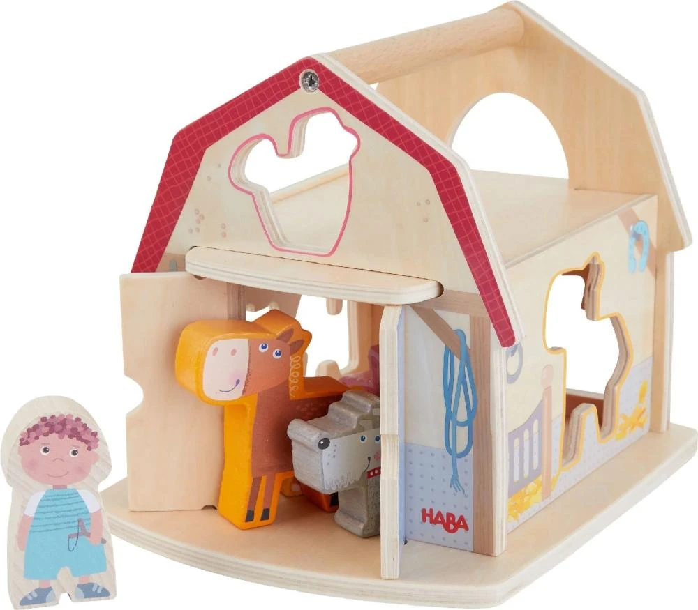 Zoraďovanie farieb a tvarov je skvelá zábava! Steny stodoly majú správny vchod pre každú figúrku. Aj prostredníctvom voľnej hry sa batoľatá zoznámia s hospodárskymi zvieratami a poskladajú ich na správne miesto v stajni. Drevené figúrky opäť vychádzajú cez pohyblivé dvere stodoly. Kompaktný drevený zásuvný domček sa dá ľahko prenášať pomocou rukoväte.