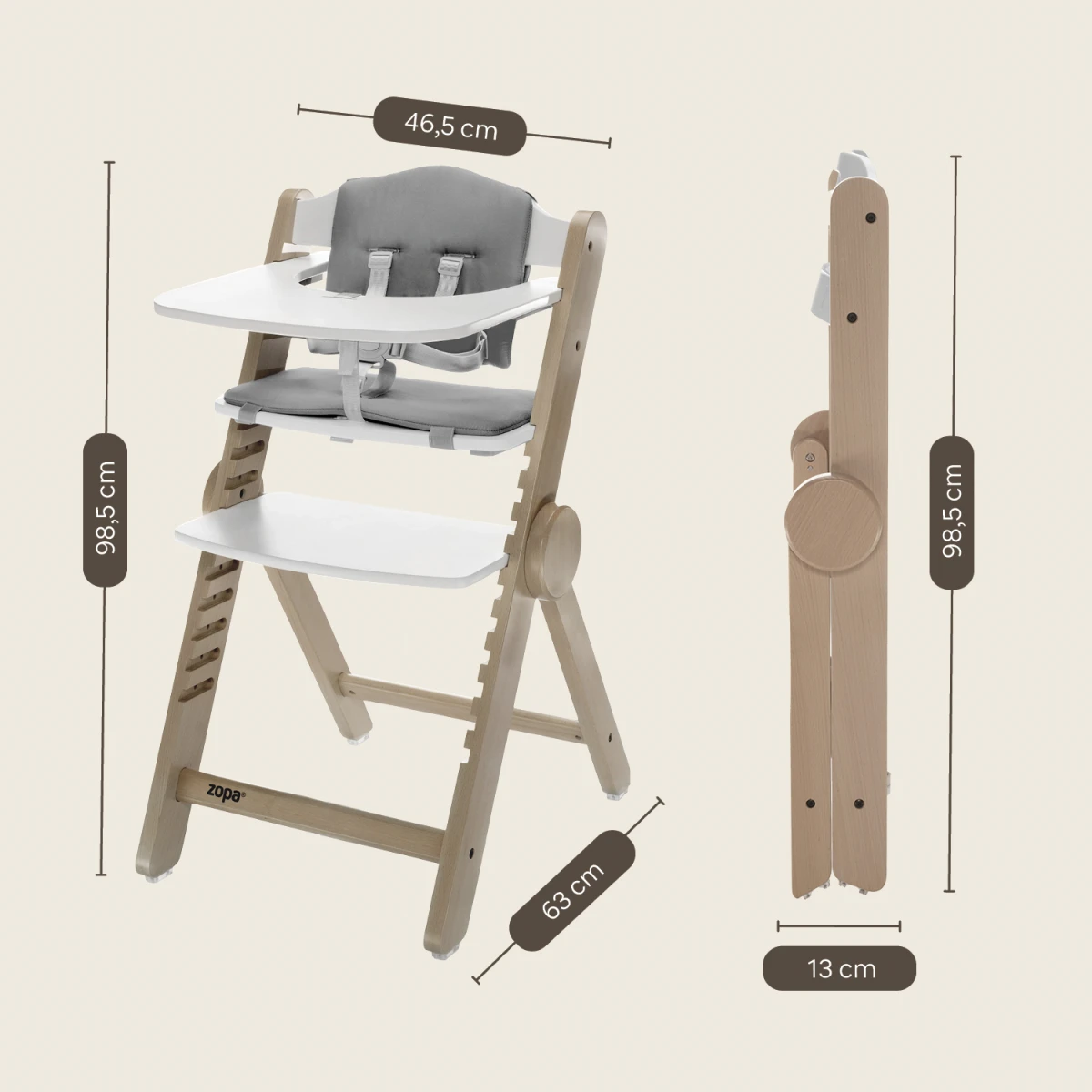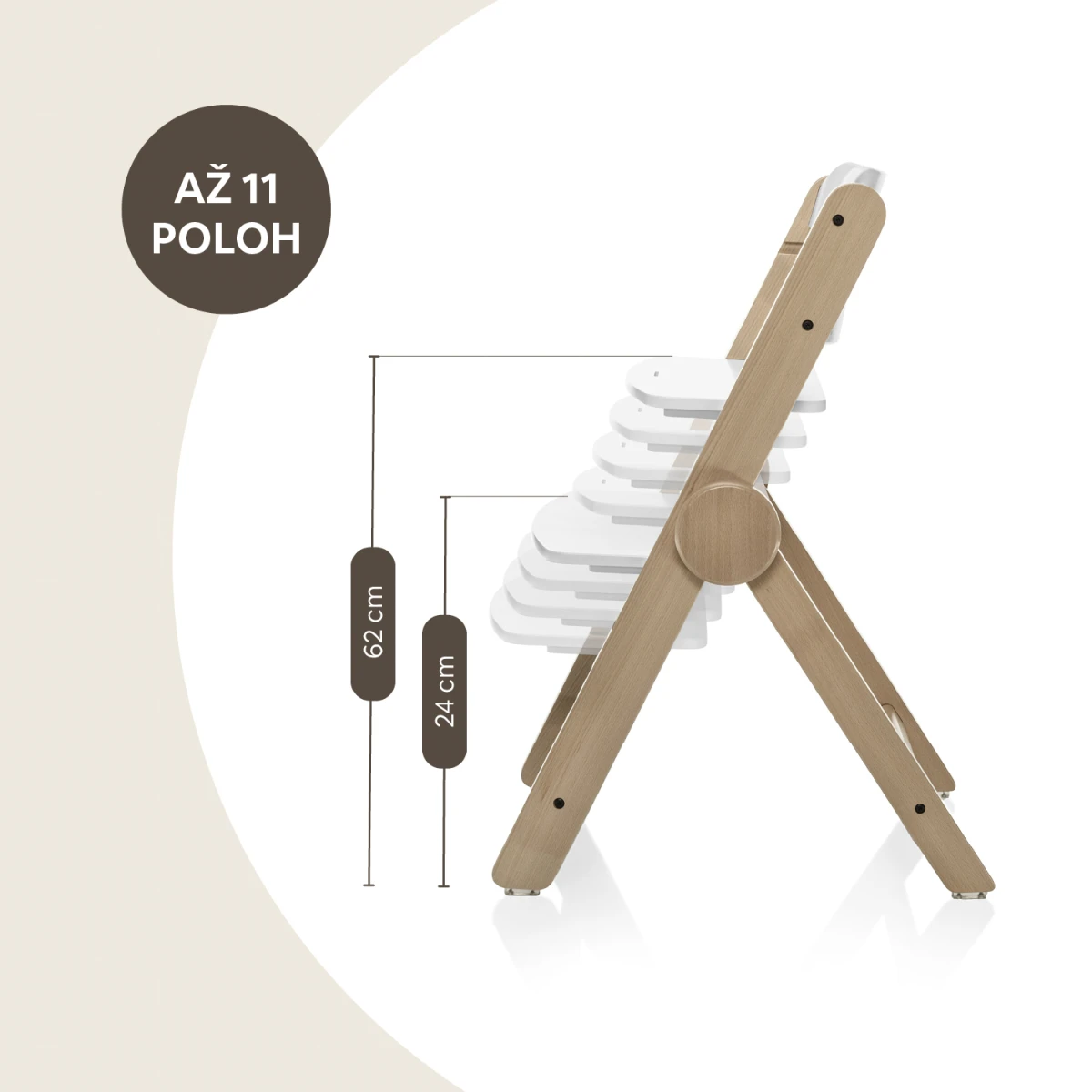 Vďaka inovatívnemu systému Clipp & Clapp je možné stoličku jednoducho prispôsobiť výške bez potreby náradia. Ako jedna z mála drevených stoličiek na trhu je možné zložiť, čo vďaka kompaktným rozmerom po zložení umožní ľahké skladovanie a madlo zase uľahčí prenášanie stoličky.