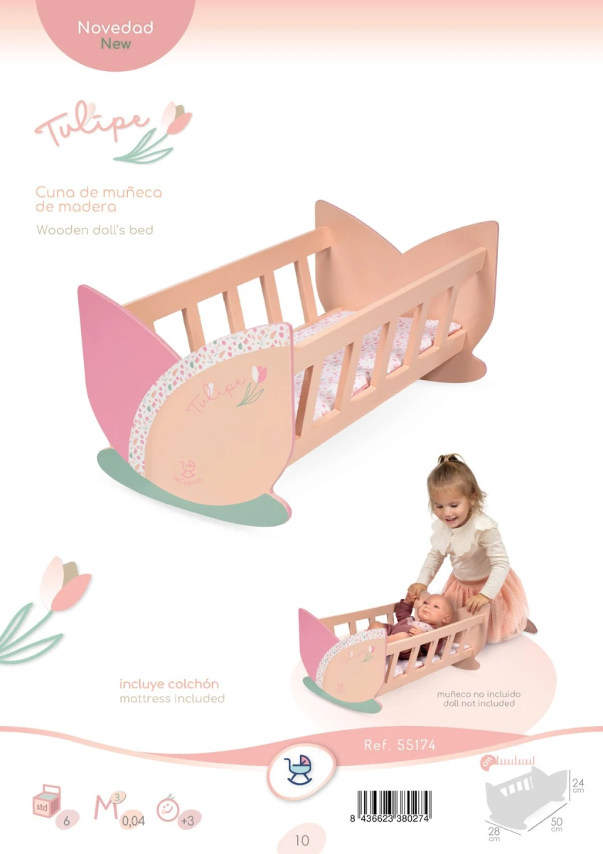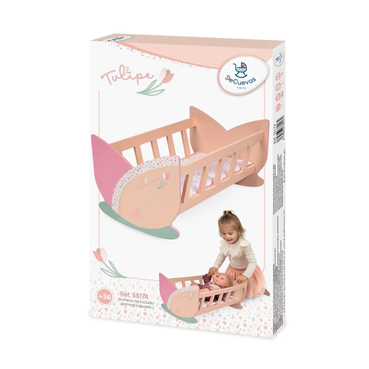 DeCuevas Drevená kolíska pre bábiky Tulipe 2025 patrí do rovnomennej kolekcie, ktorá je novinkou roku 2025 a ponúka výber výrobkov od jedálenských sád cez postieľky a kočíky až po drevený nábytok pre bábiky.