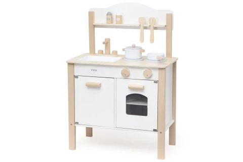 Moderná biela drevená kuchyňa ponúka deťom priestor na kreatívnu hru, rozvíja ich fantáziu a prináša radosť z objavovania sveta varenia.