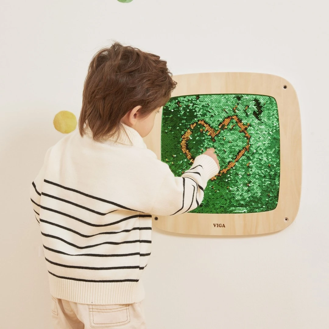 Tento otočný nástenný panel s flitrovými prvkami má jedinečný obojstranný dizajn, jedna strana je zelená a druhá žltá.