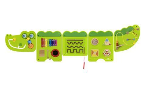 Zábavná drevená nástenná hra v tvare krokodíla ponúka deťom pestré aktivity, ktoré rozvíjajú ich zručnosť, logické myslenie a koordináciu pohybov. Obsahuje xylofón, magnetické bludisko, ozubené kolieska a ďalšie interaktívne prvky, ktoré zaručia hodiny objavovania a zábavy. Ideálny doplnok do detskej izby, škôlky alebo herne.