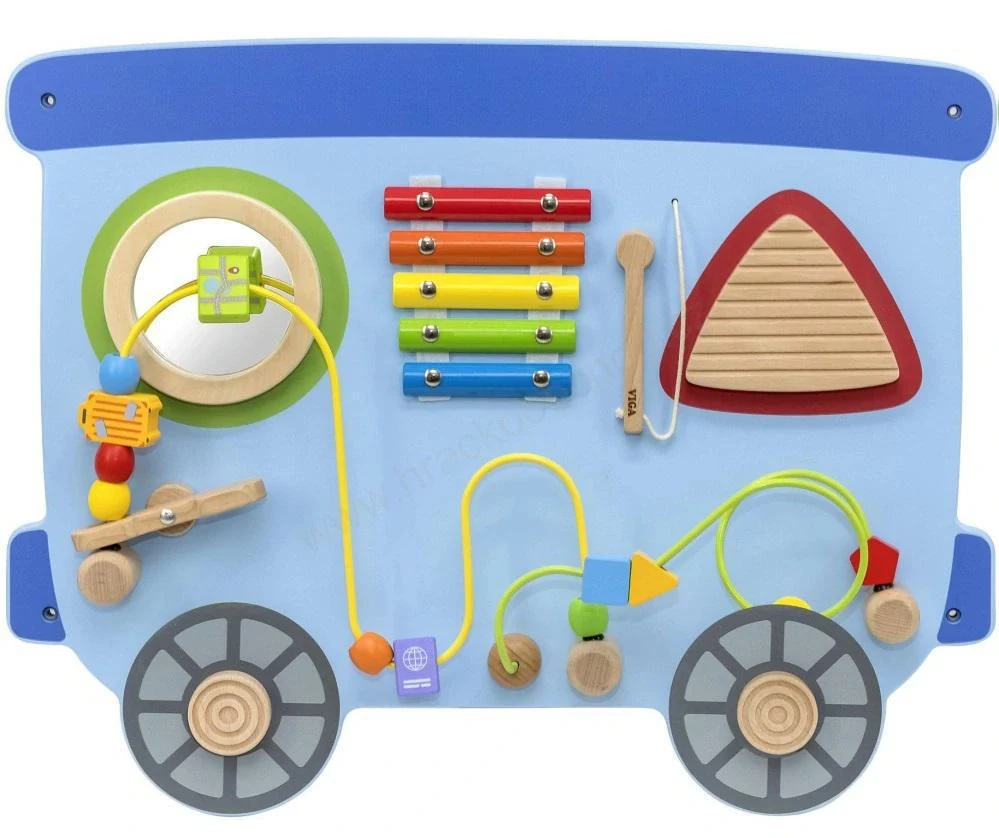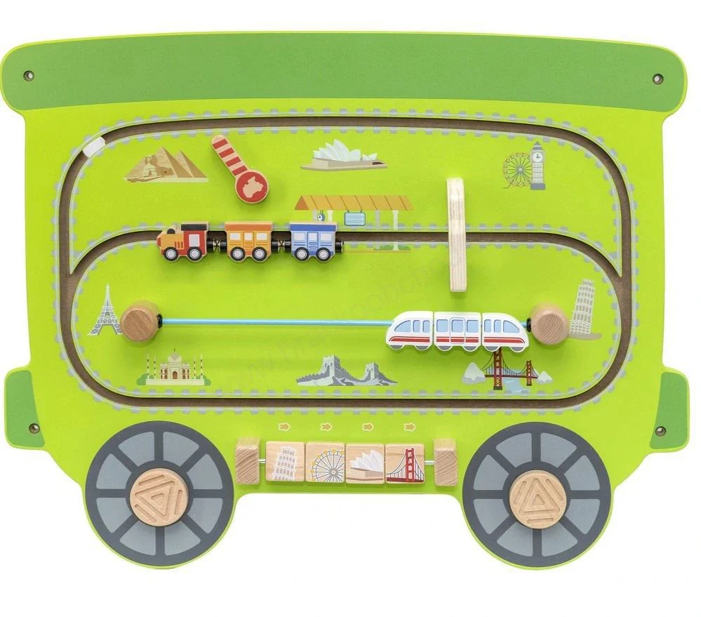 Drevená nástenná hra vláčik s vagónikmi. Obsahuje množstvo herných prvkov pre rozvoj detskej motoriky.