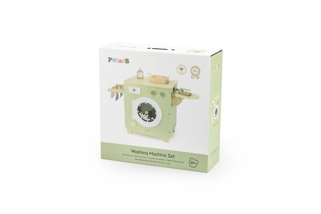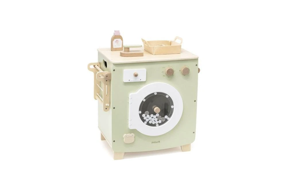 Drevená práčka s doplnkami. Balenie obsahuje práčku, fľaštičku s tekutým práškom, košík na bielizeň, štipce a niekoľko kúskov oblečenia.