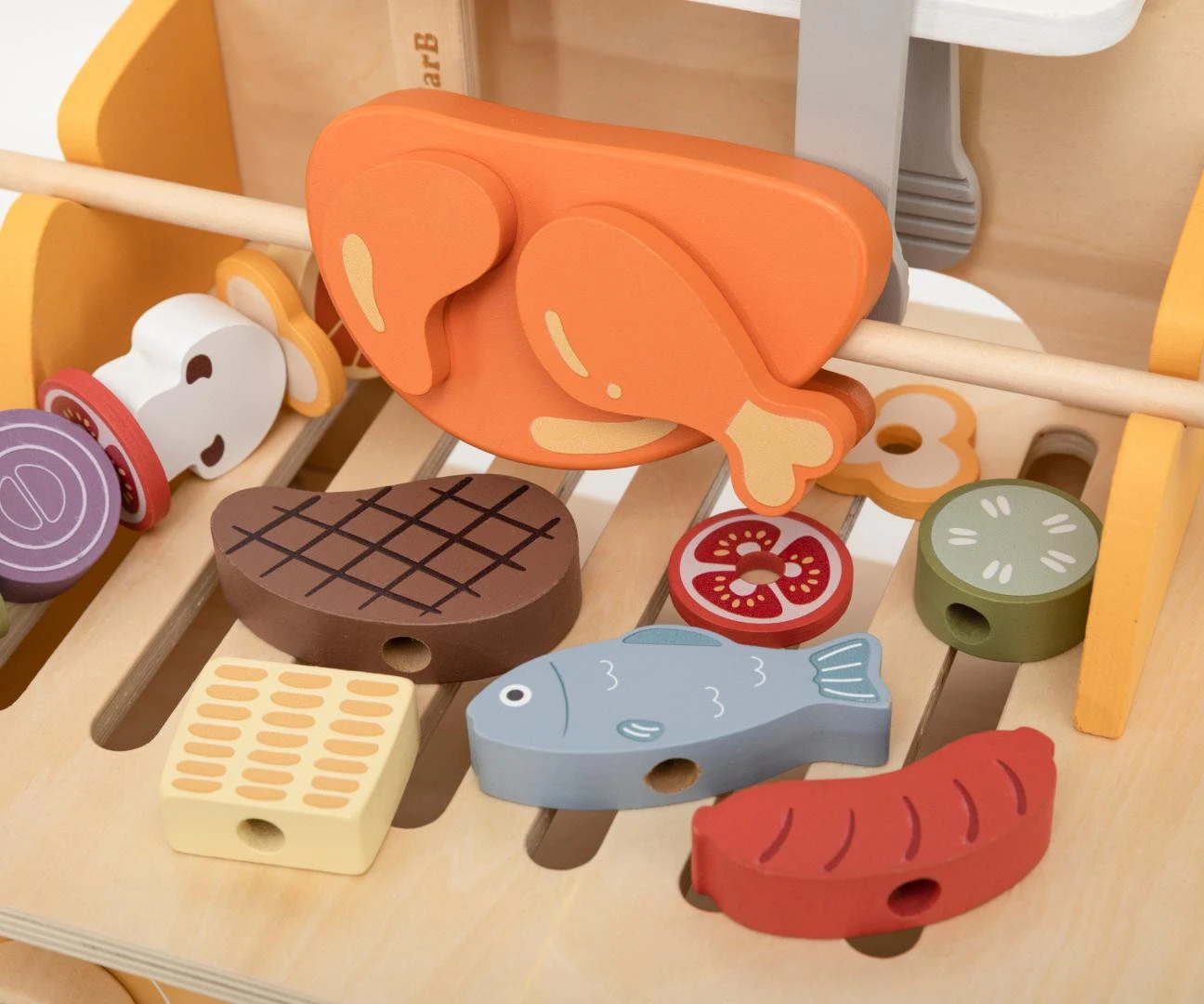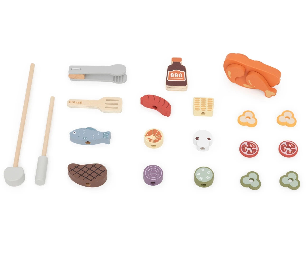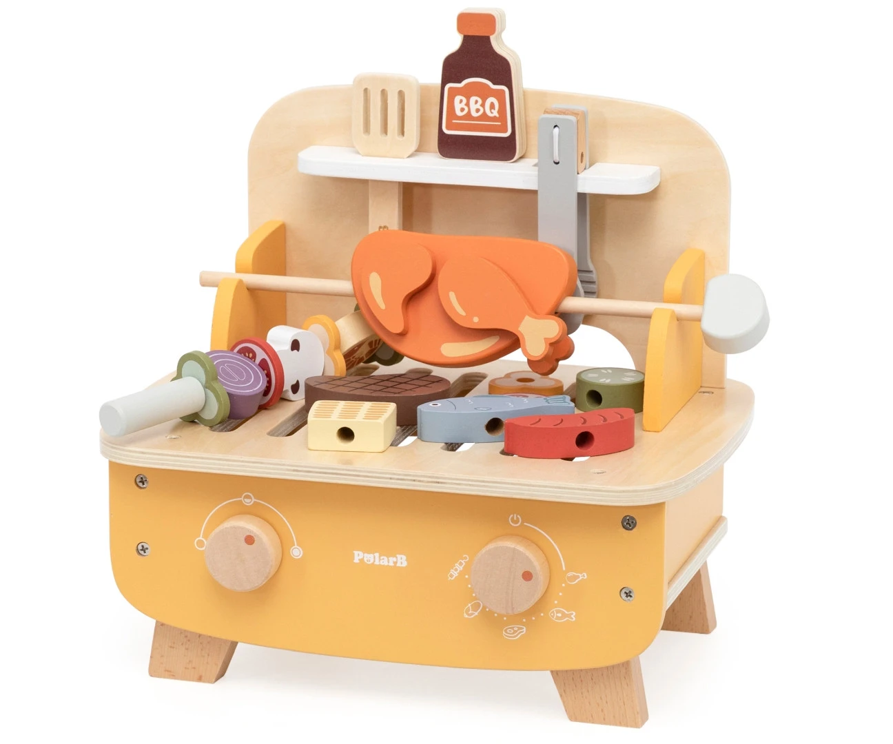 Drevený gril s bohatým príslušenstvom ponúka deťom zábavnú a bezpečnú hru na malých kuchárov.