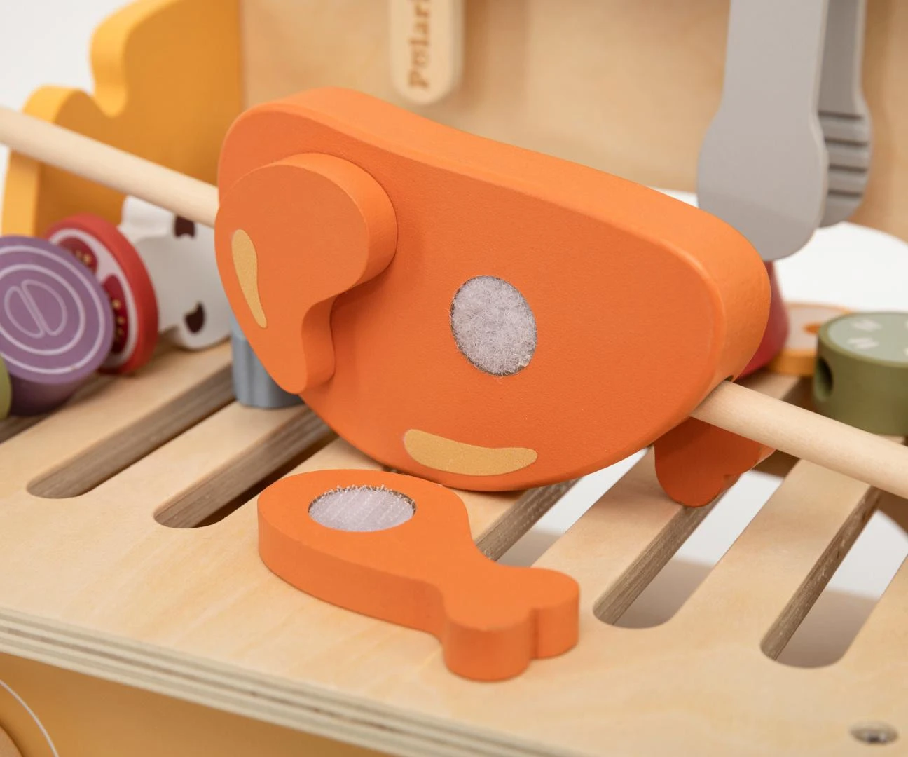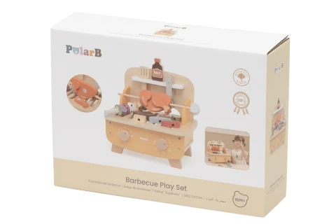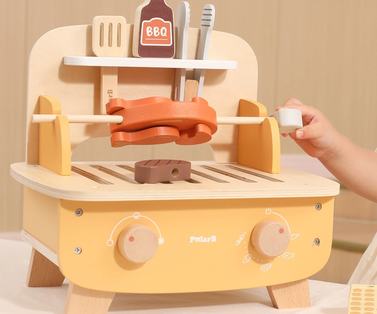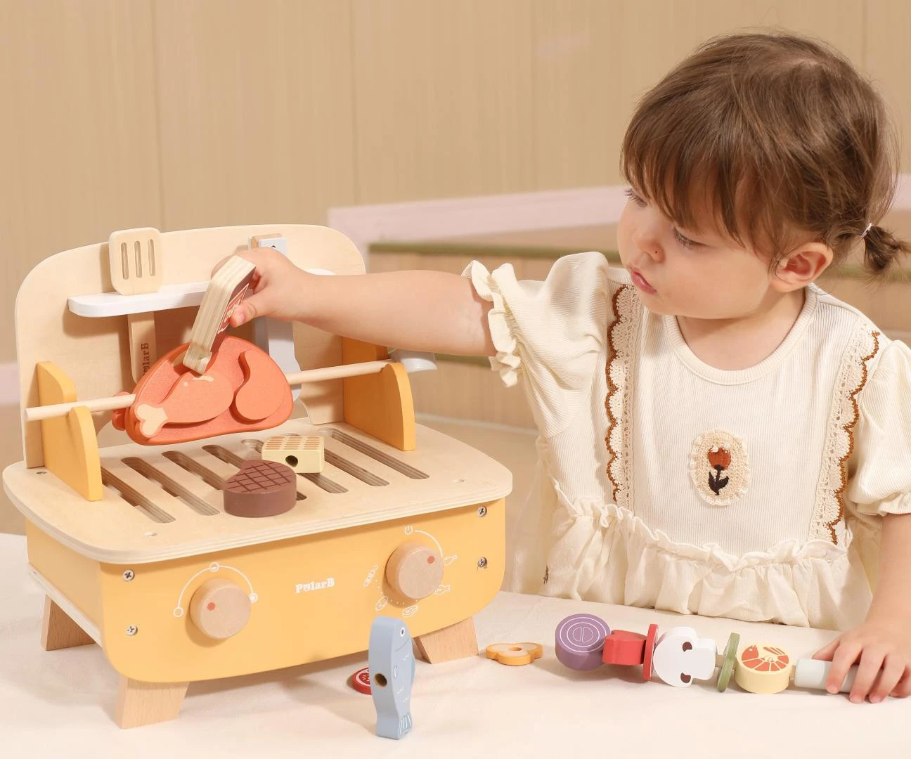 Drevený gril s bohatým príslušenstvom ponúka deťom zábavnú a bezpečnú hru na malých kuchárov.