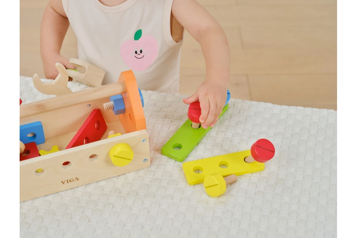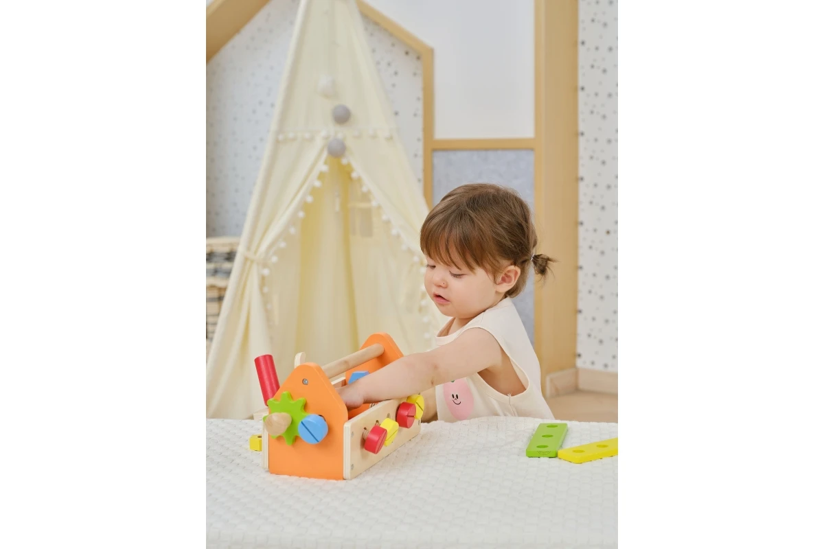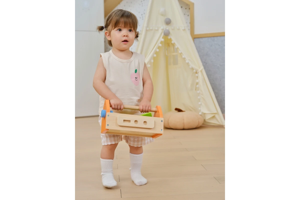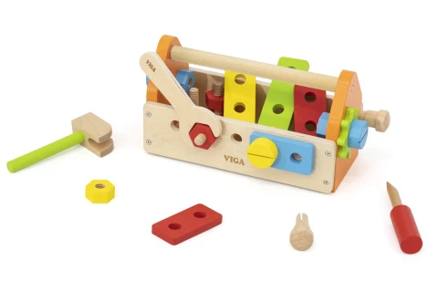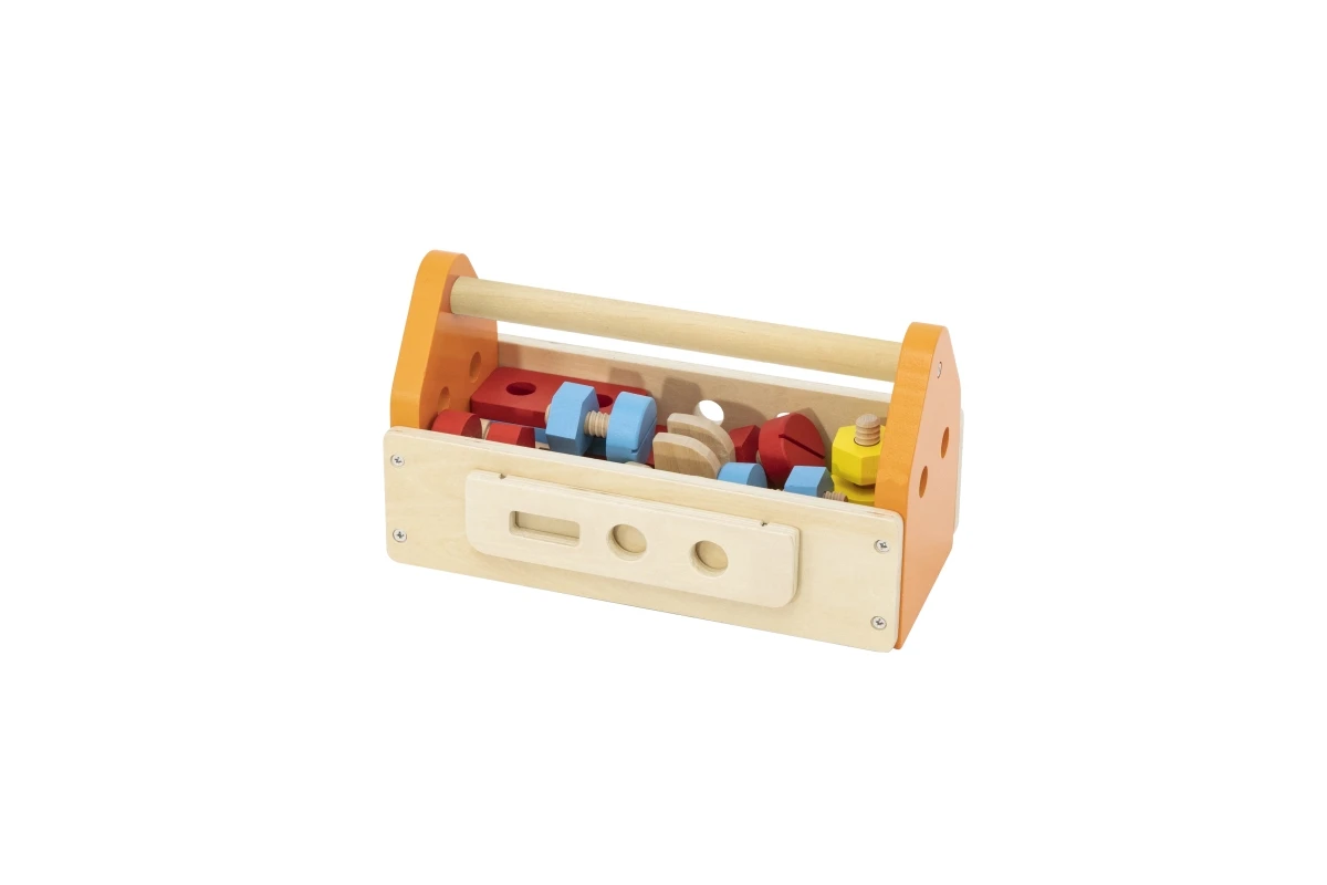 Drevená debna s náradím je skvelá hračka pre malých domácich majstrov, ktorí radi napodobňujú dospelých. V praktickej drevenej debničke deti nájdu 24 dielikov náradia a príslušenstva, s ktorými sa môžu hrať, triediť ich, prenášať a ukladať.
