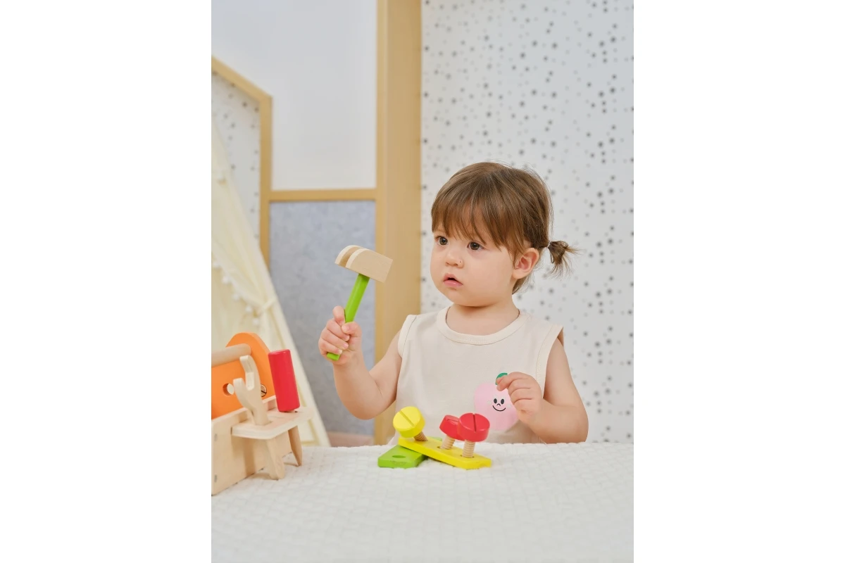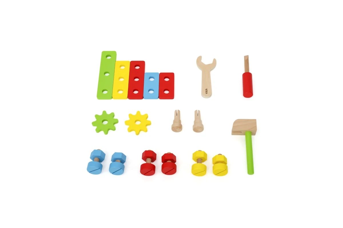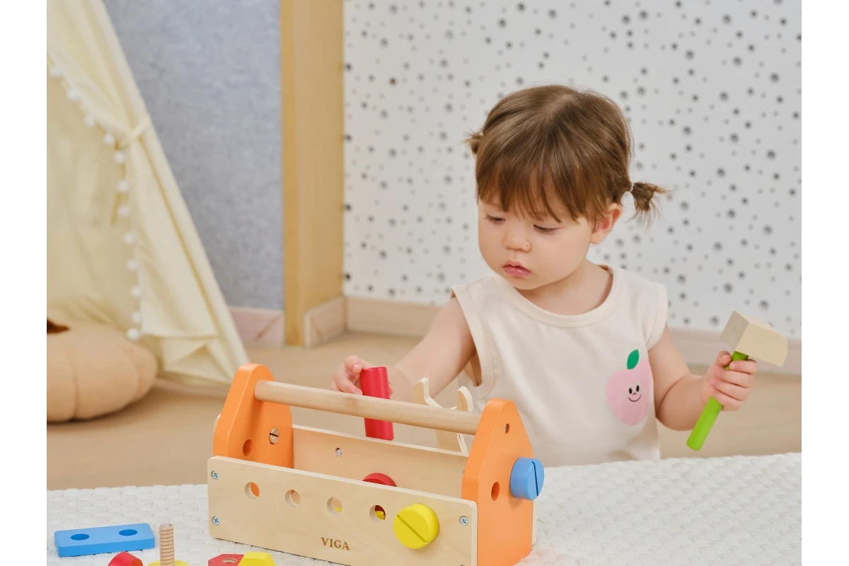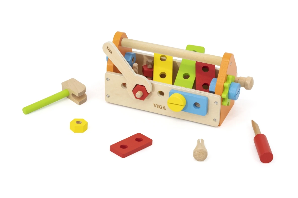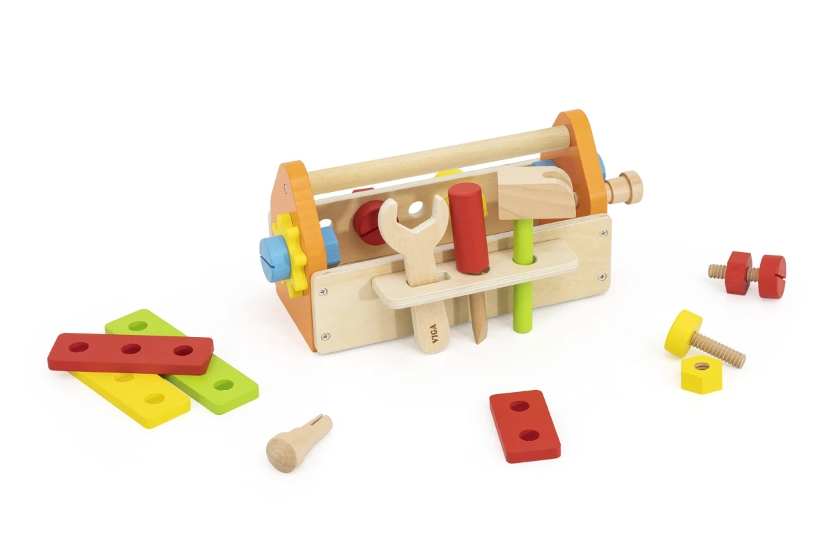 Drevená debna s náradím je skvelá hračka pre malých domácich majstrov, ktorí radi napodobňujú dospelých. V praktickej drevenej debničke deti nájdu 24 dielikov náradia a príslušenstva, s ktorými sa môžu hrať, triediť ich, prenášať a ukladať.